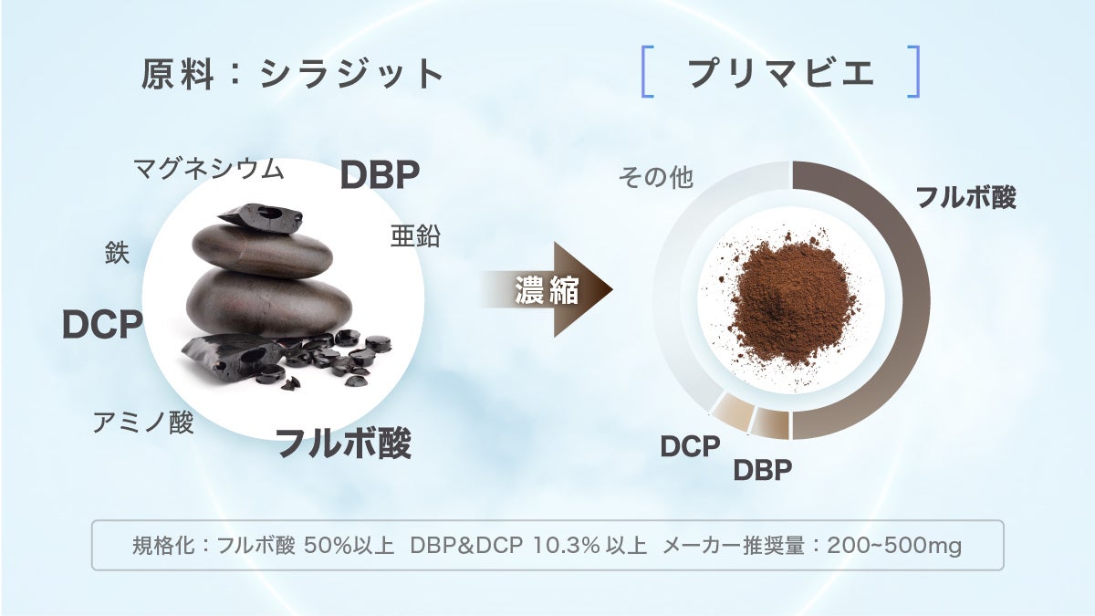 プリマビエとは約5000万年前に2つの大陸が衝突し、海に生息していたプランクトンや海洋度、ミネラル等の高栄養化な物質が圧縮されて出来たシラジットを精製した奇跡の素材。男性としてのパフォーマンスをサポートするフルボ酸を50%濃度で規格化。その他にもDBP、DCPと呼ばれる有用成分を高濃度で抽出し規格化した特許素材であり、妊活やメンズウェルネスに関する研究データが豊富。