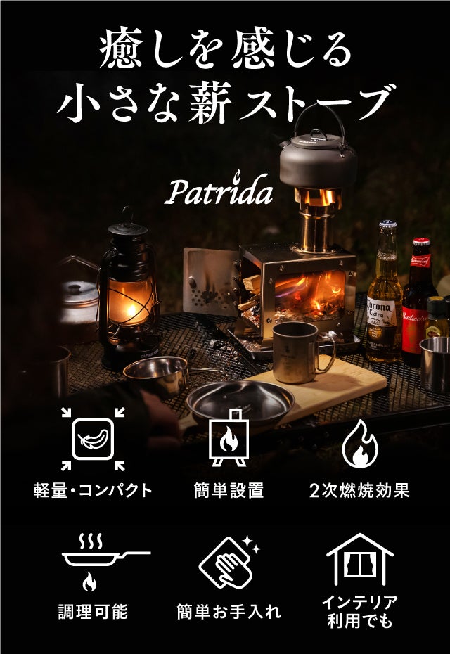 『日常のお仕事や家事等で多忙な毎日を送られている皆様に癒しを与えて、くつろぎとやすらぎの時間を過ごして頂きたい。』そんな思いを抱きつつ、新商品のリリースを目指してまいりました。この度、弊社の新規商品として、【小さな薪ストーブPatrida】を皆様にご紹介できることを実行者としてうれしく思います。