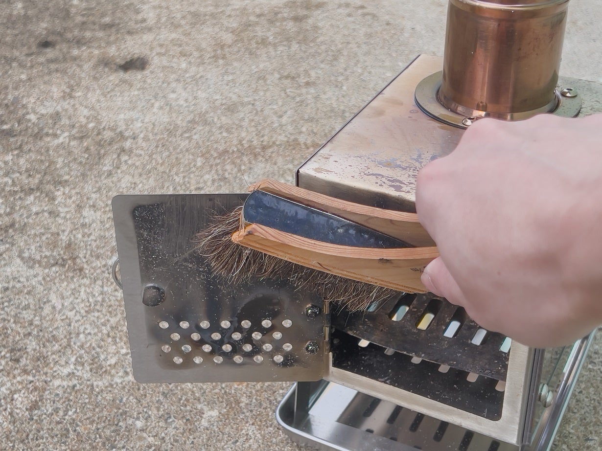 汚れが気になる場合は中性洗剤をつけてブラシなどで磨く(正面ガラス・ストーブ内にある中敷きは取り外せません。)