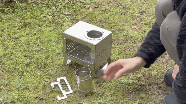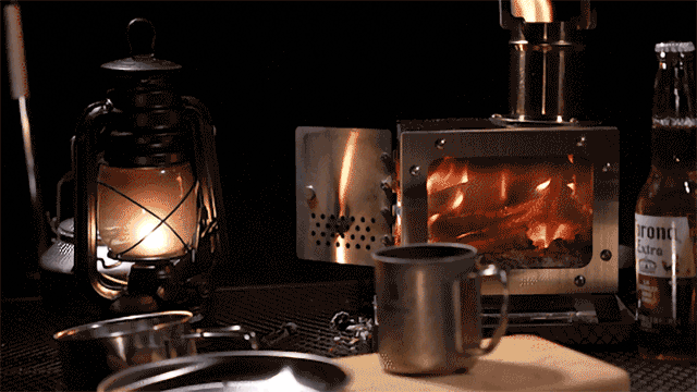 煙突の上に五徳(調理スタンド)があり、調理ができる。