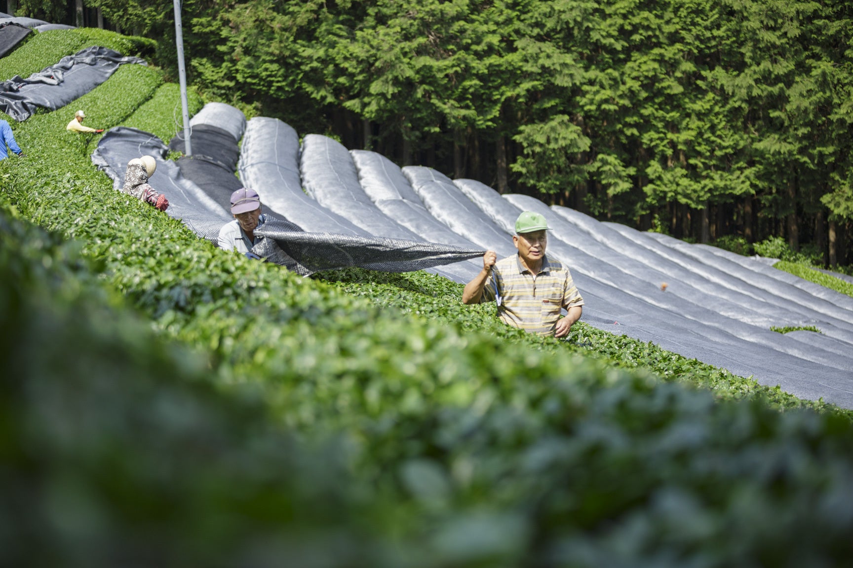 旨味を増やすために、収穫の2週間ほど前から茶の樹に被覆をします。