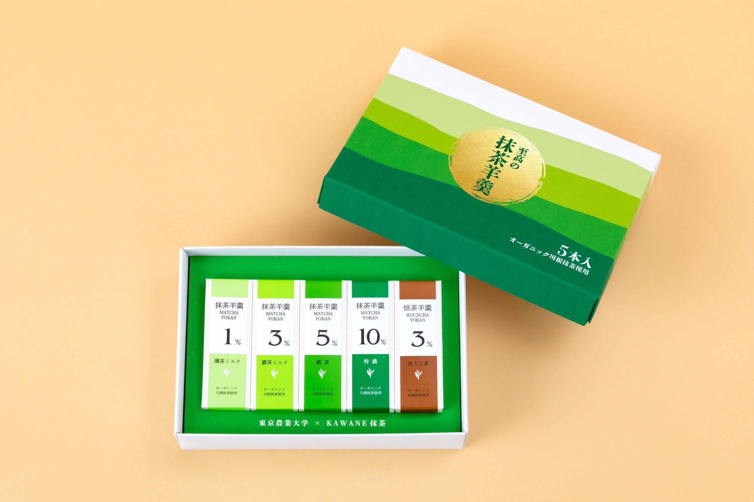 川根の有機抹茶をより楽しんでもらうため、抹茶味は濃さを【 1% / 3% / 5% / 10%】の4種類用意しました。一番濃い10%の抹茶羊羹は、一般的な抹茶羊羹に比べてなんと20倍もの抹茶を使用しています!ぜひ、食べ比べてみてお気に入りの一本を見つけてください。