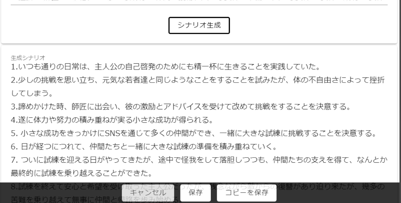 Chat GPTを利用した簡易シナリオ制作機能の開発状況のご報告をさせていただきます。