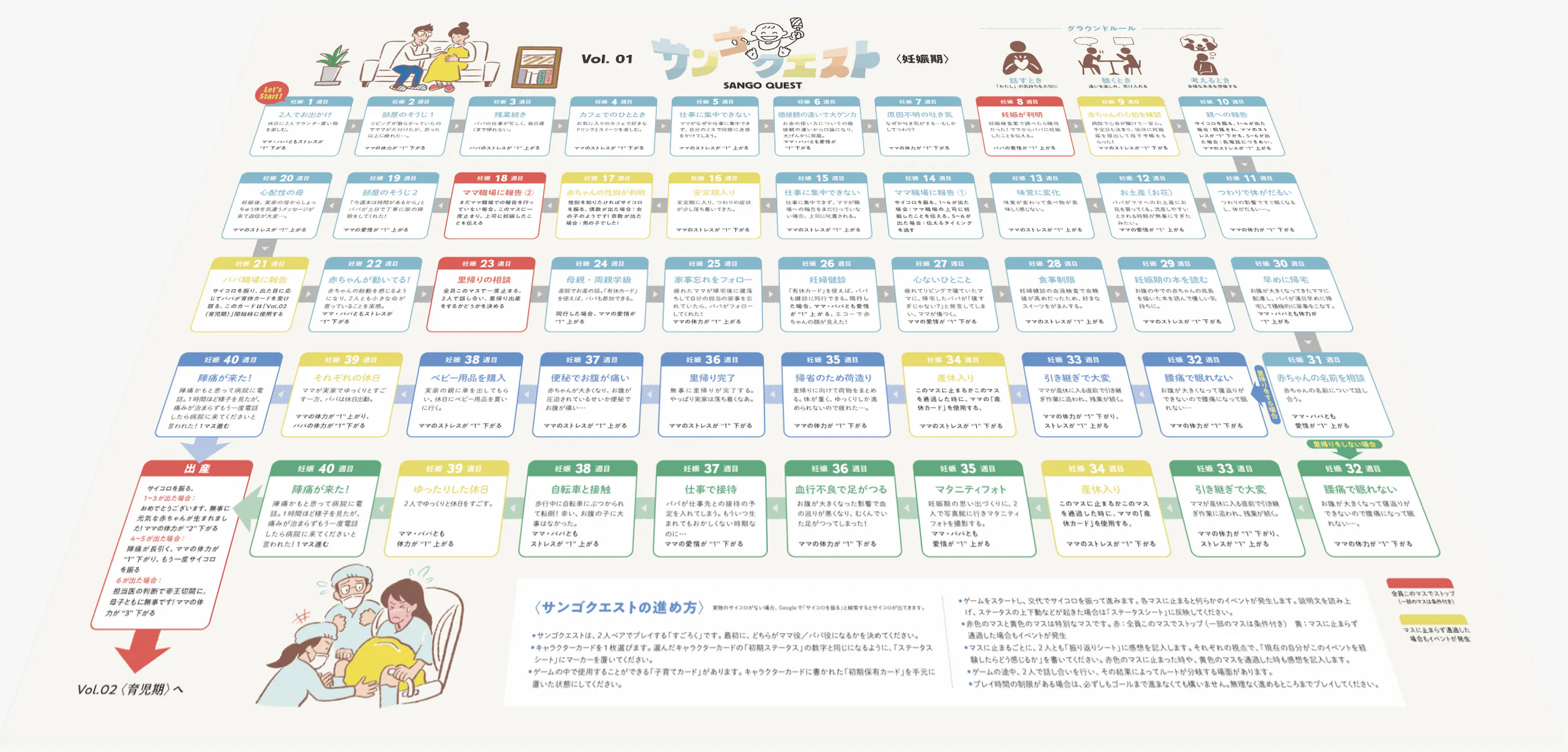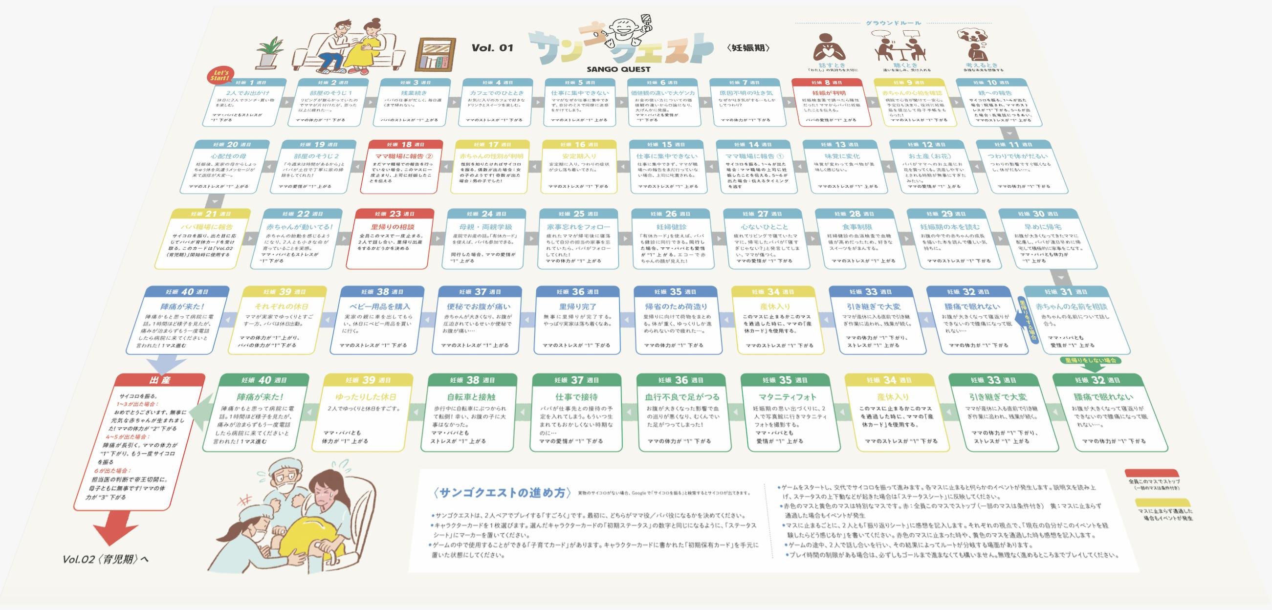 こうした事情を背景に私たちが開発しているサンゴクエストは、妊娠から出産を経て子どもが1歳になるまでの2年弱の期間を、時系列に沿って体験していくボードゲームです。