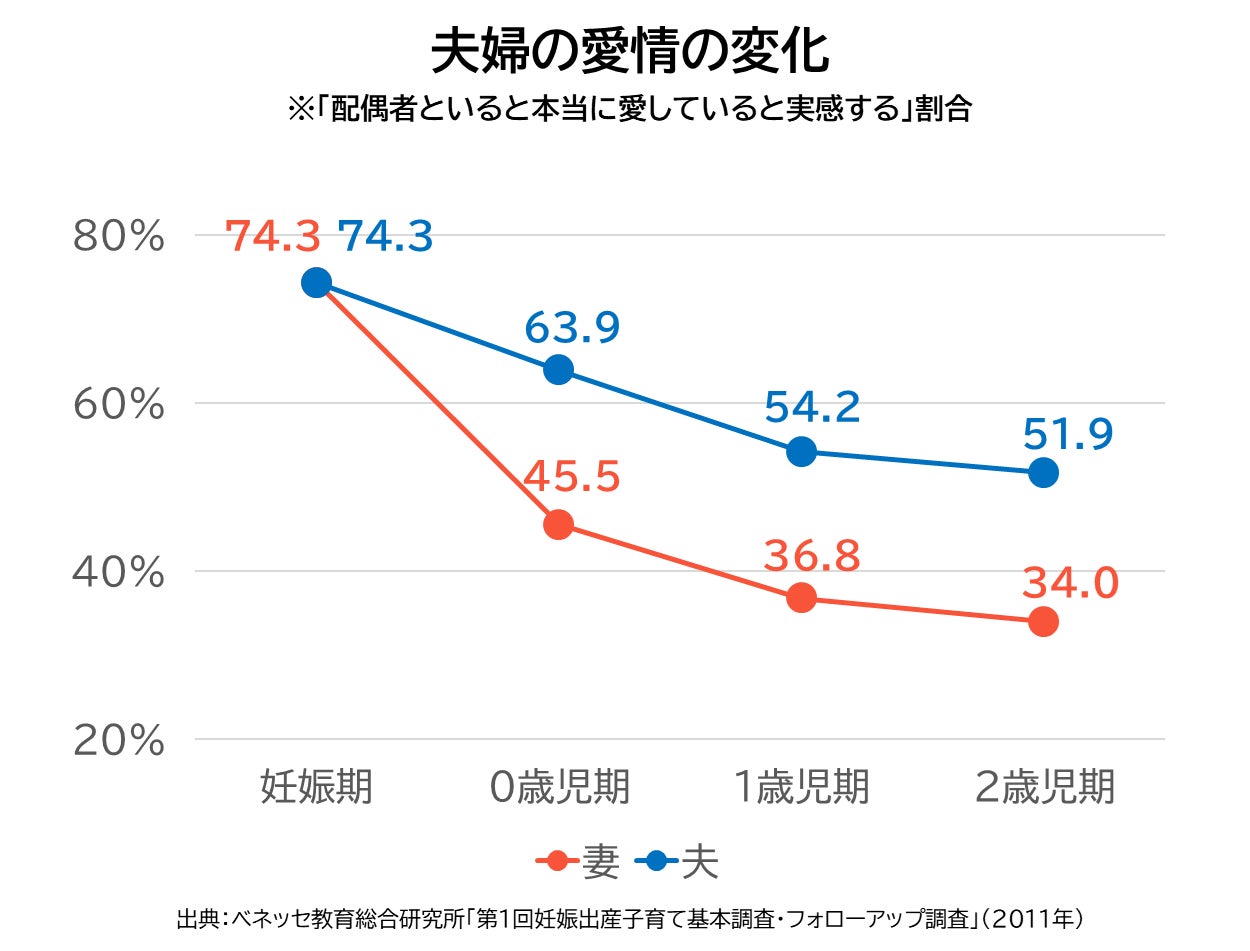 子どもが小さい時期に愛情が低下してしまうカップルが多い要因としては、妊娠・出産前後の女性のホルモンバランスの変化なども影響しているようですが、男性の家事・育児分担率が低く、それにより女性が孤立しストレスをため込んでしまうことが大きいと考えられています。