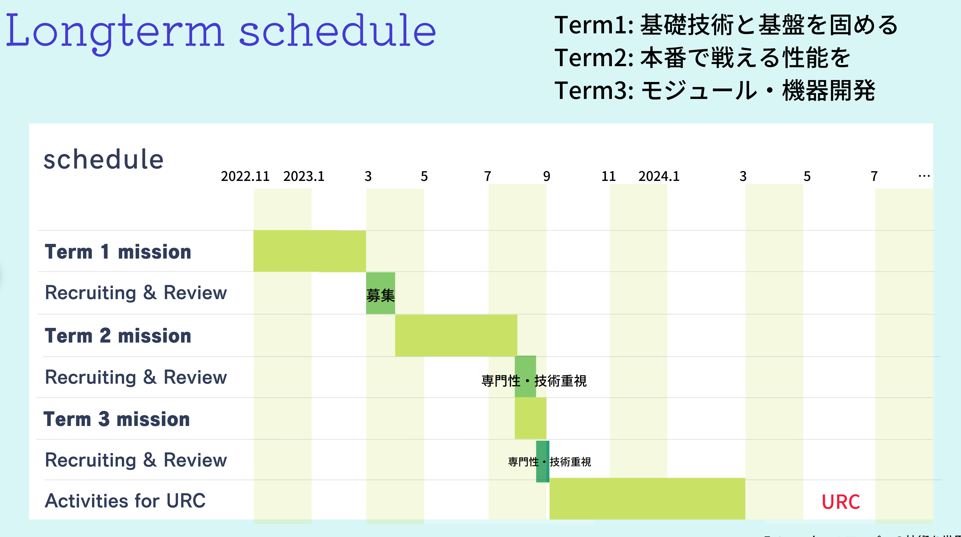 プロジェクトは、2022年11月からスタートする「Term1」、2023年4月から「Term2」、2023年8月から「Term3」の3つのタームに分かれております。現在は「Term1」のフェーズで探査機の試作機初号機を開発しています。2023年3月には、試作機を用いた実験を実施する予定です。Term2、Term3では探査機の細部をさらに改良し、機体の作成を行います。