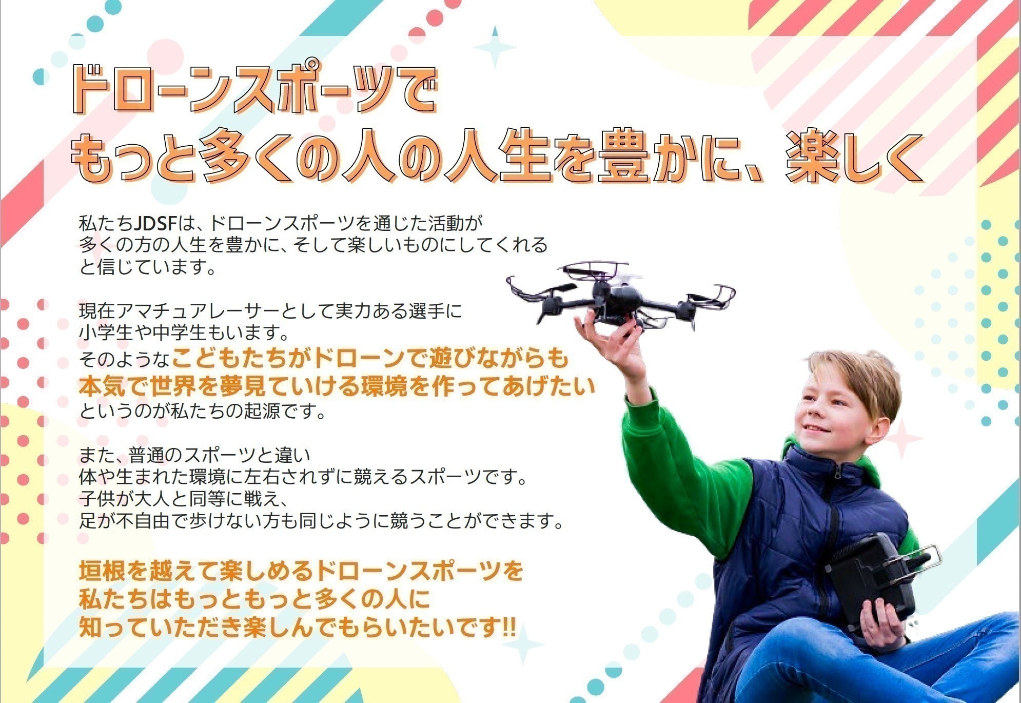 私たちJDSFは、ドローンスポーツを通じた活動が多くの方の人生を豊かに、そして楽しいものにしてくれると信じています。
