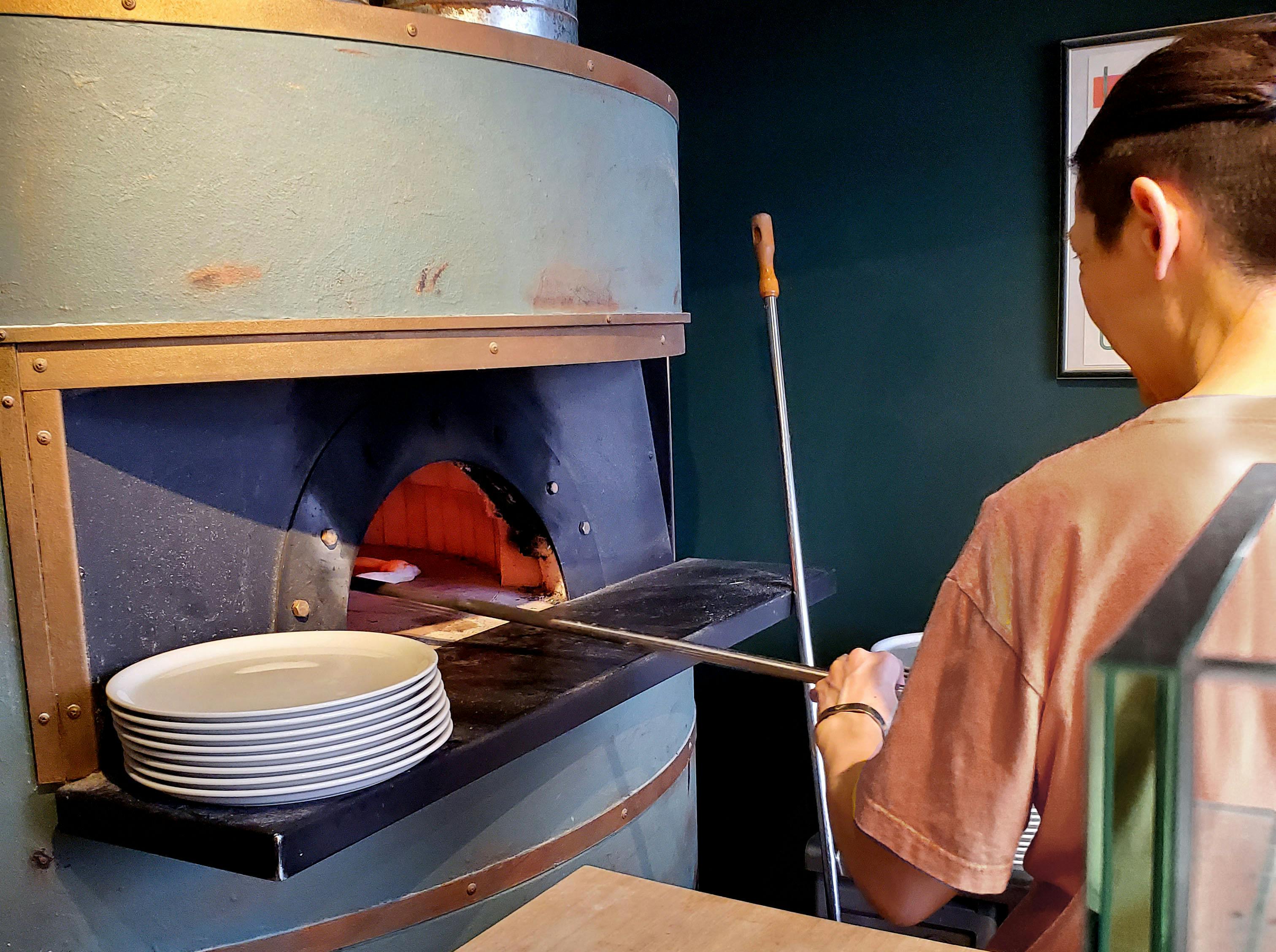 入口すぐにある特注の薪窯を使って短時間で焼き上げ、焼き立てをすぐにお客様のもとへ