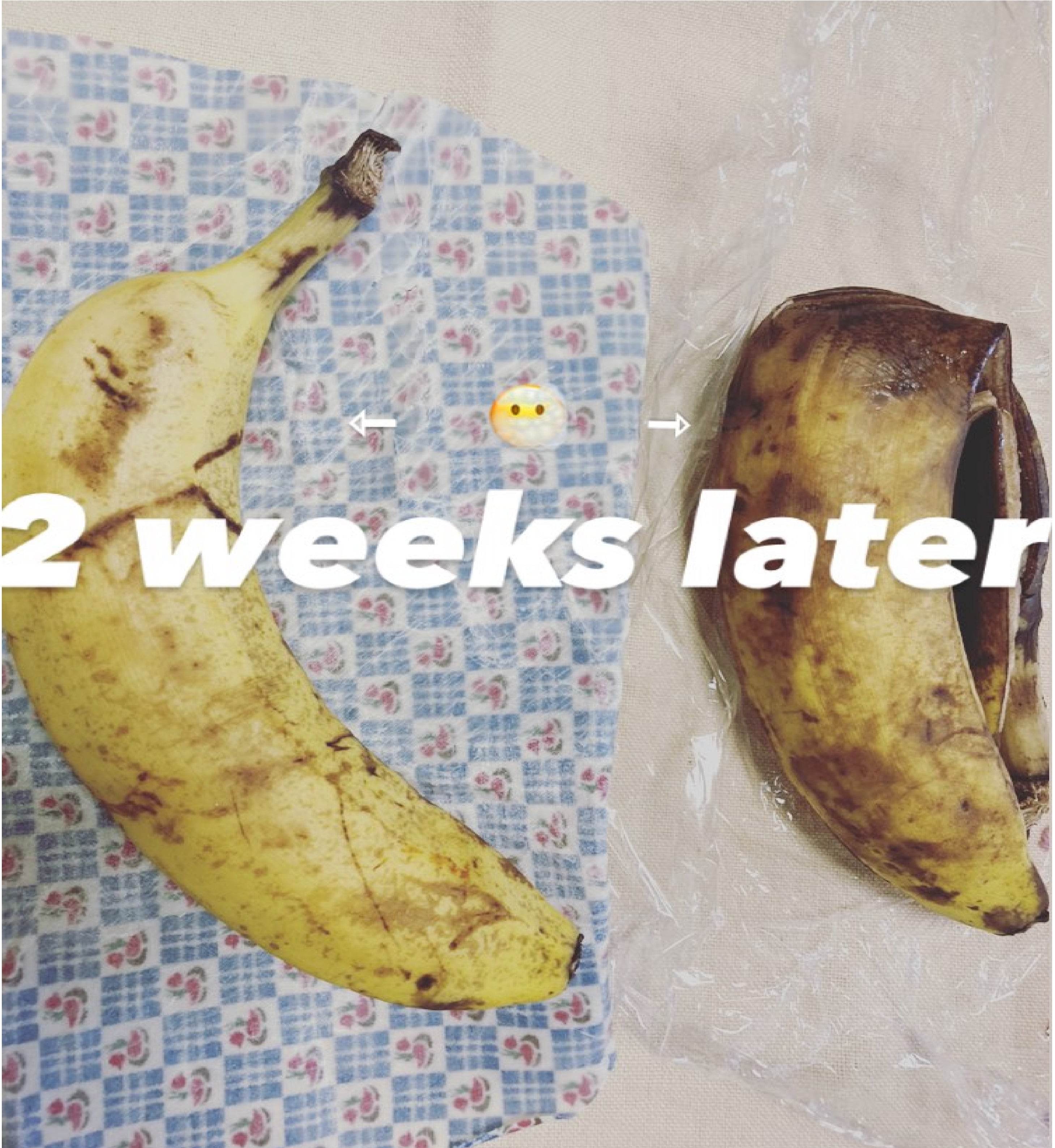 ↑元々賞味期限が近いバナナを2週間包んでみた。左がミツロウラップ/右がプラスチックラップ