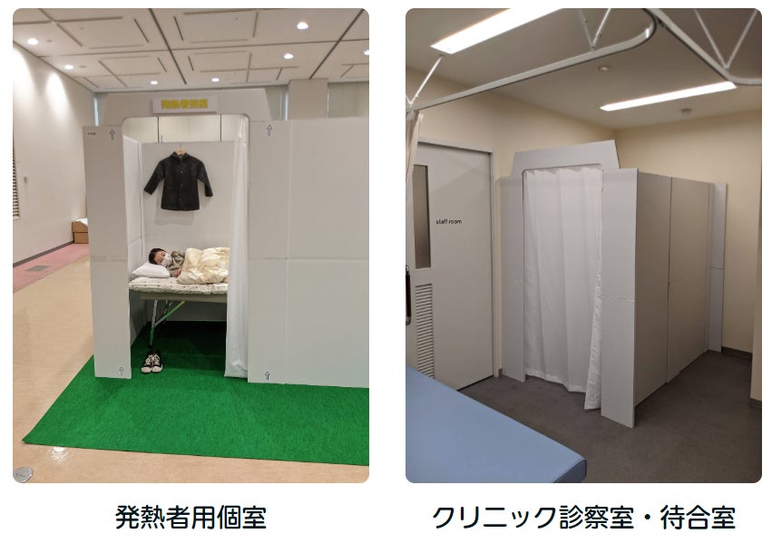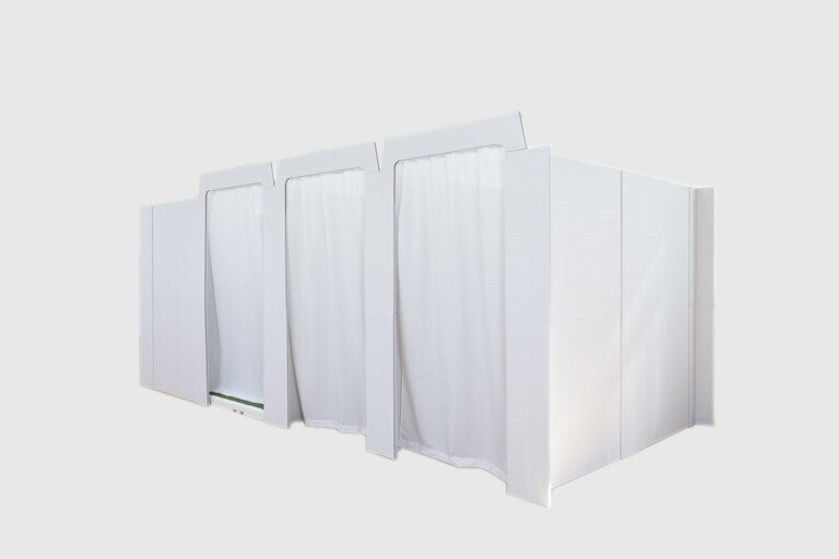 単体で使用するのももちろん可能ですが、こんな風に複数個をつなぎ合わせることもできます。避難所などのパーテーションとしてはもちろん、診察室として、遊び空間として、フィッティングルームや授乳室など、様々な個室の需要に対応できます。