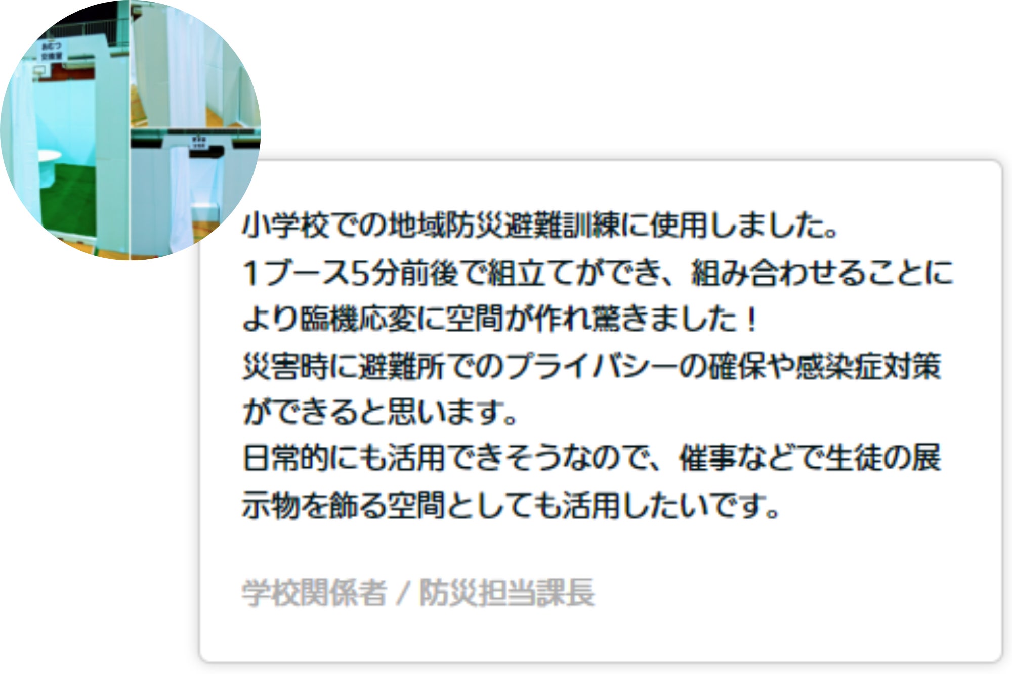 避難所のパーテーションとして備蓄するのはもちろん、診察室の仕切りとして、遊び空間として、フィッティングルームや授乳室など、区切った空間が必要な場合にすぐ取り出して組み立てることができますし、使わないときはたたんでコンパクトに収納できます。ぜひその使いやすさを体感してください!