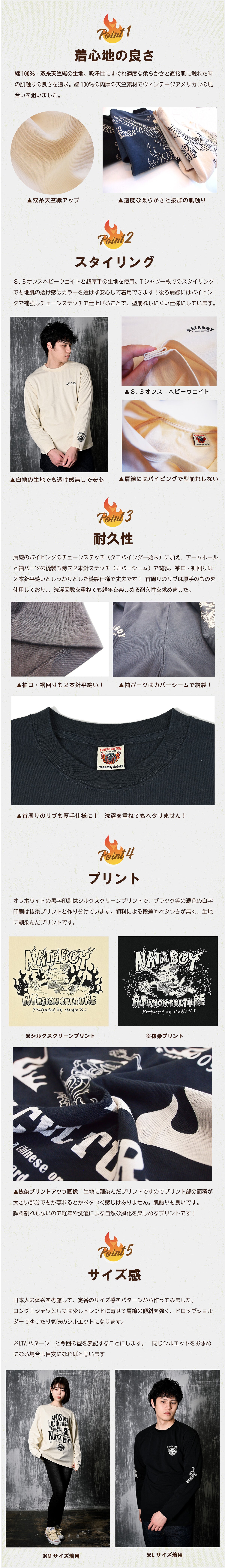 基本的に黒字のプリントはシルクスクリーンプリントでプリントしております。対して白字のプリントは抜染プリントでプリントしております。顔料は生地に馴染む感じに仕上がるように狙って一体感のある手触り、プリント部分でベタっとしたり着用時に蒸れるというのが無いようにこのプリントにしています。また、洗濯などでプリント部分の色落ちや顔料の割れなども避けることも狙っておりますので、洗濯を重ねる場合にかすれていくなど、ヴィンテージ感の味わいを楽しんで頂ければと思います。
