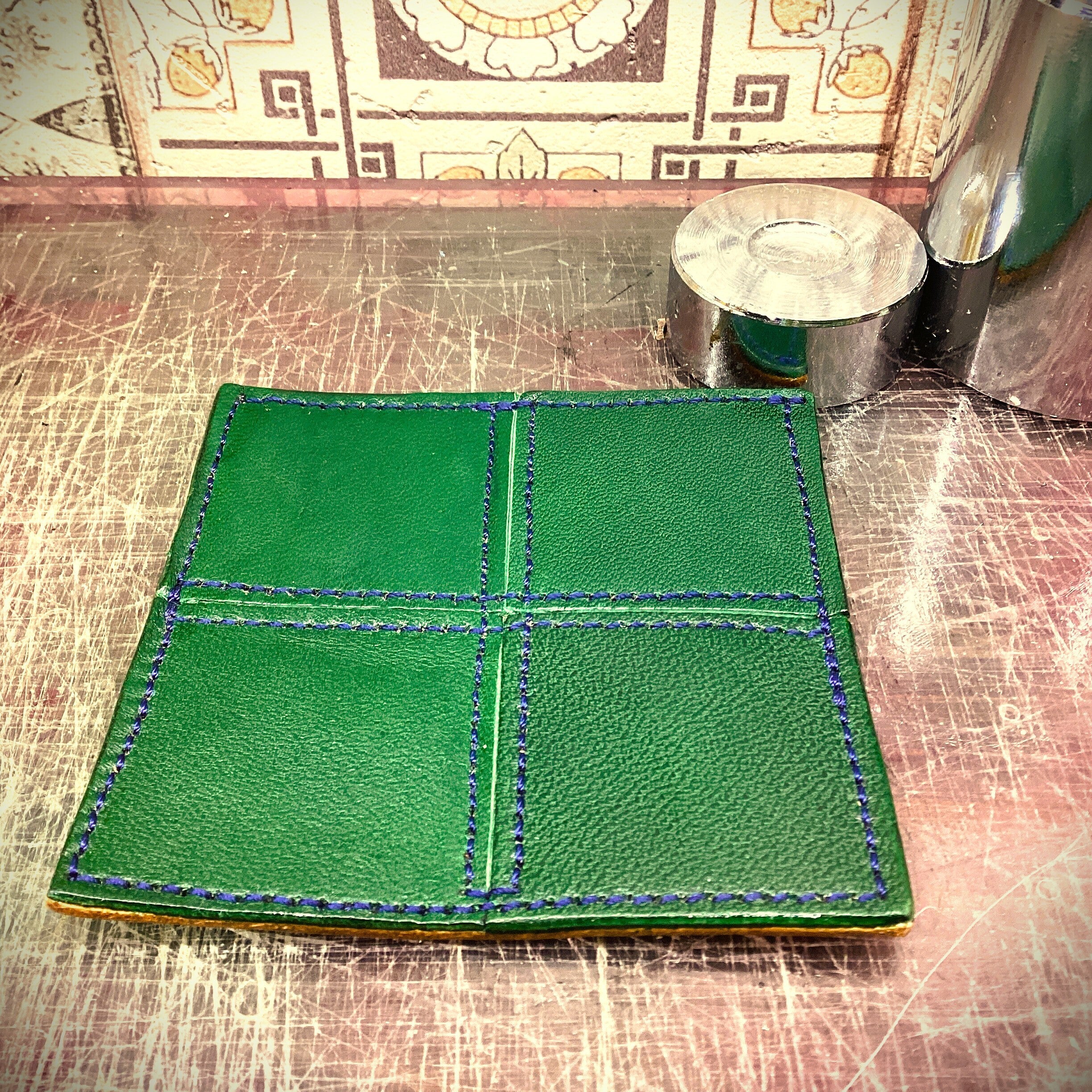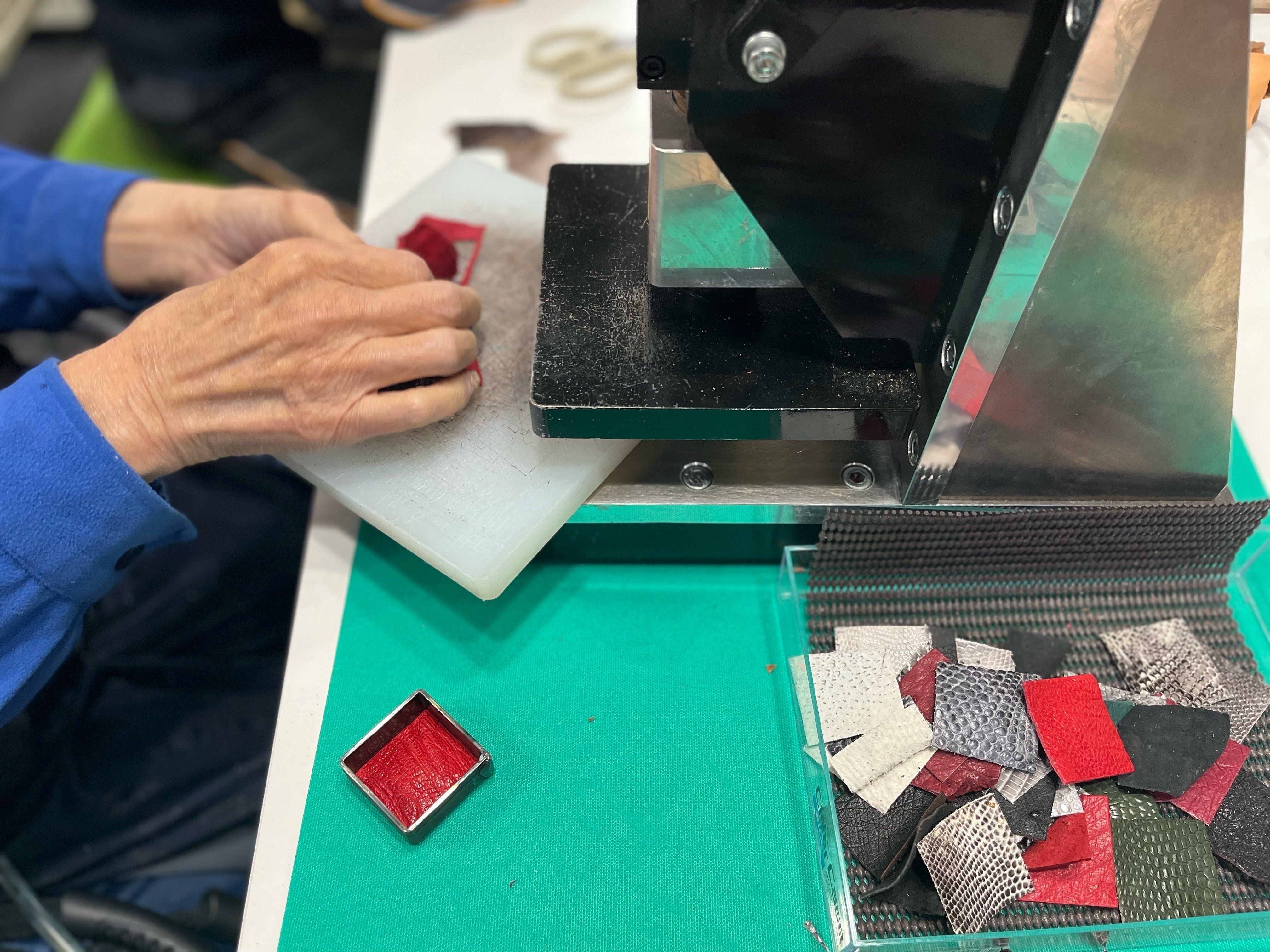 クリッカーと言う機械で、4センチ正方形の刃型を使って革を切り抜いて行きます。エキゾチックレザーは牛革に比べて分厚くて硬い部分が多くて大変苦労しました。