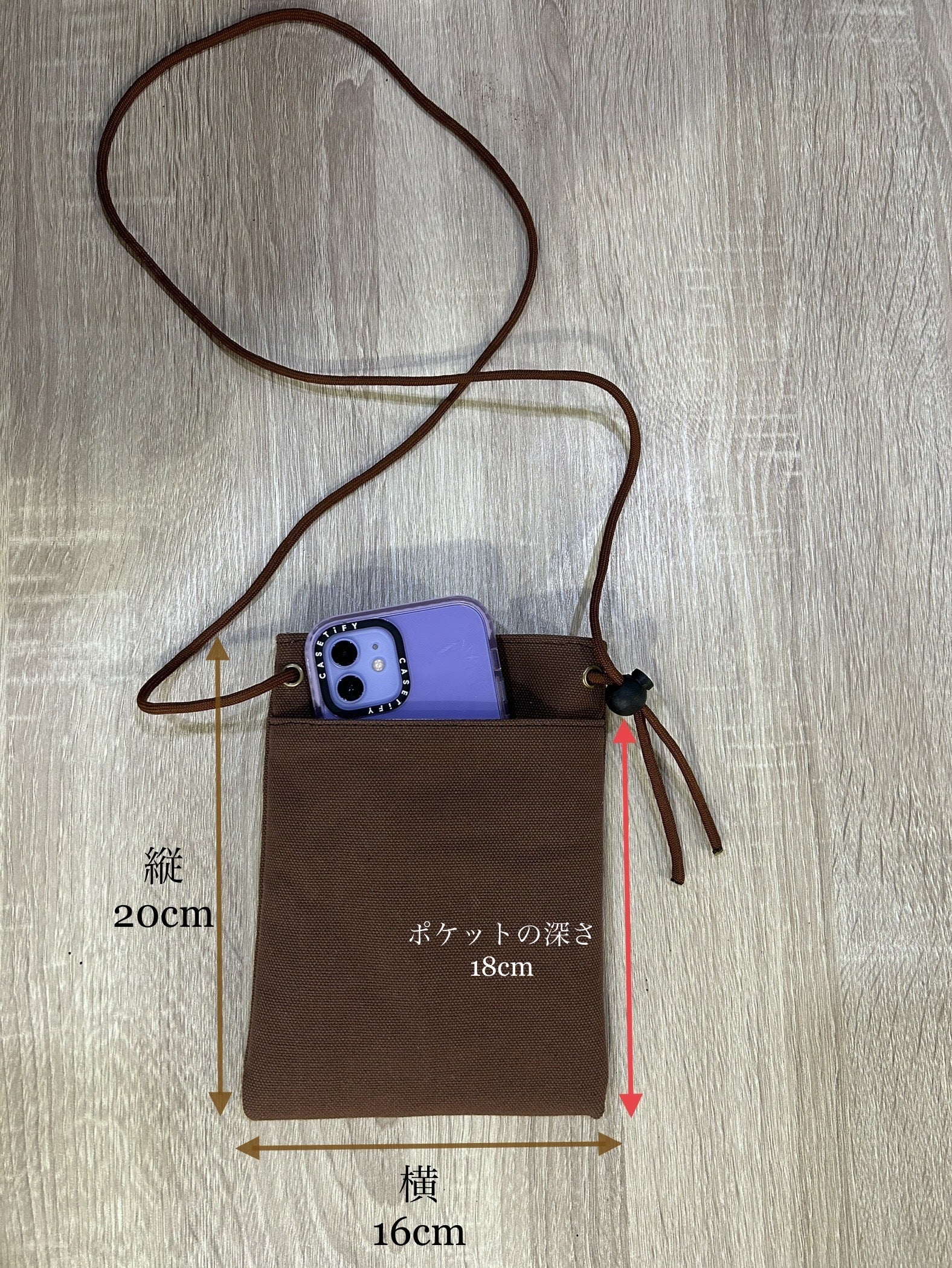 ・縦20㎝×横16㎝ ・外ポケット深さ18cm ・紐 最大150cm