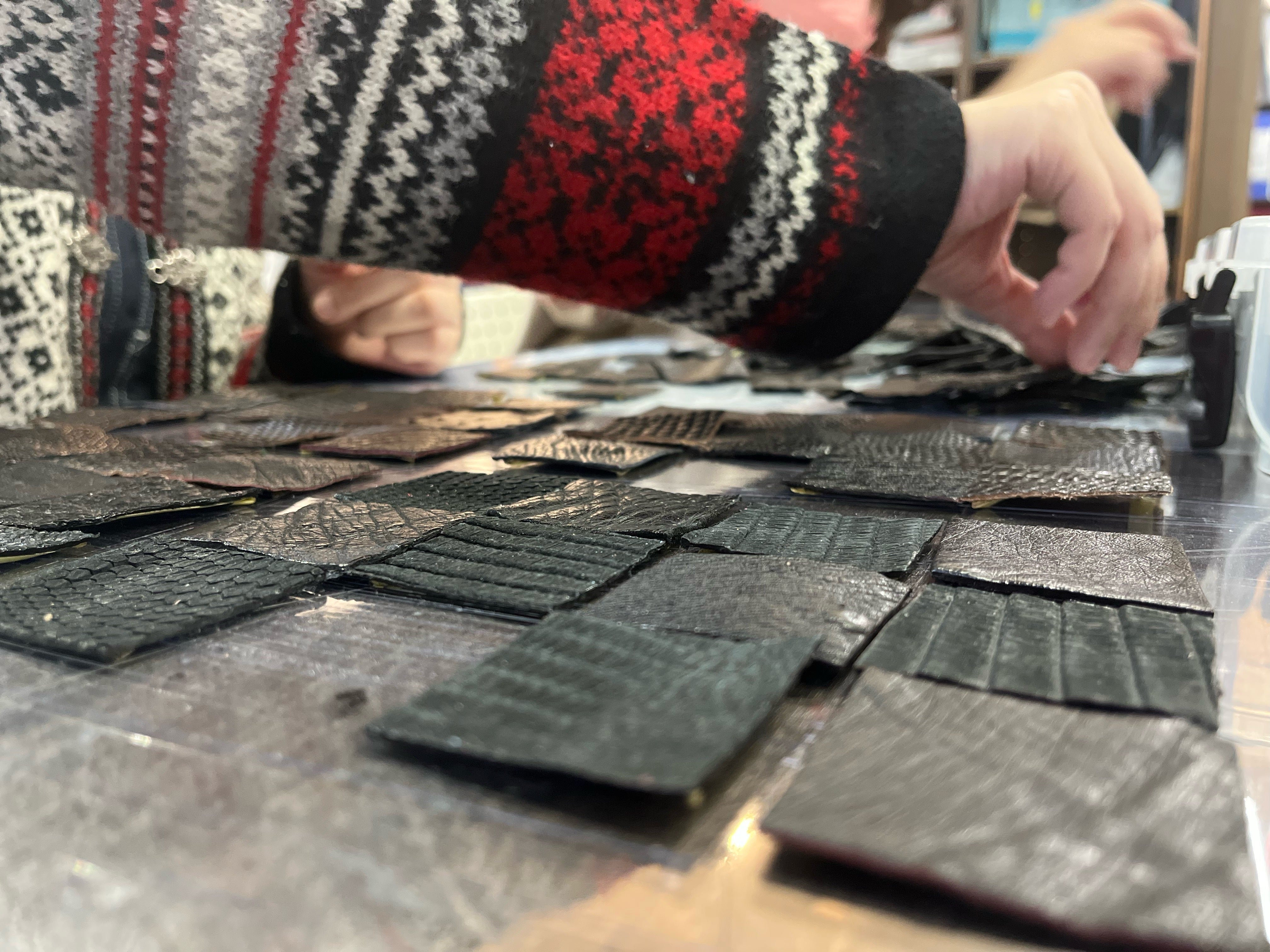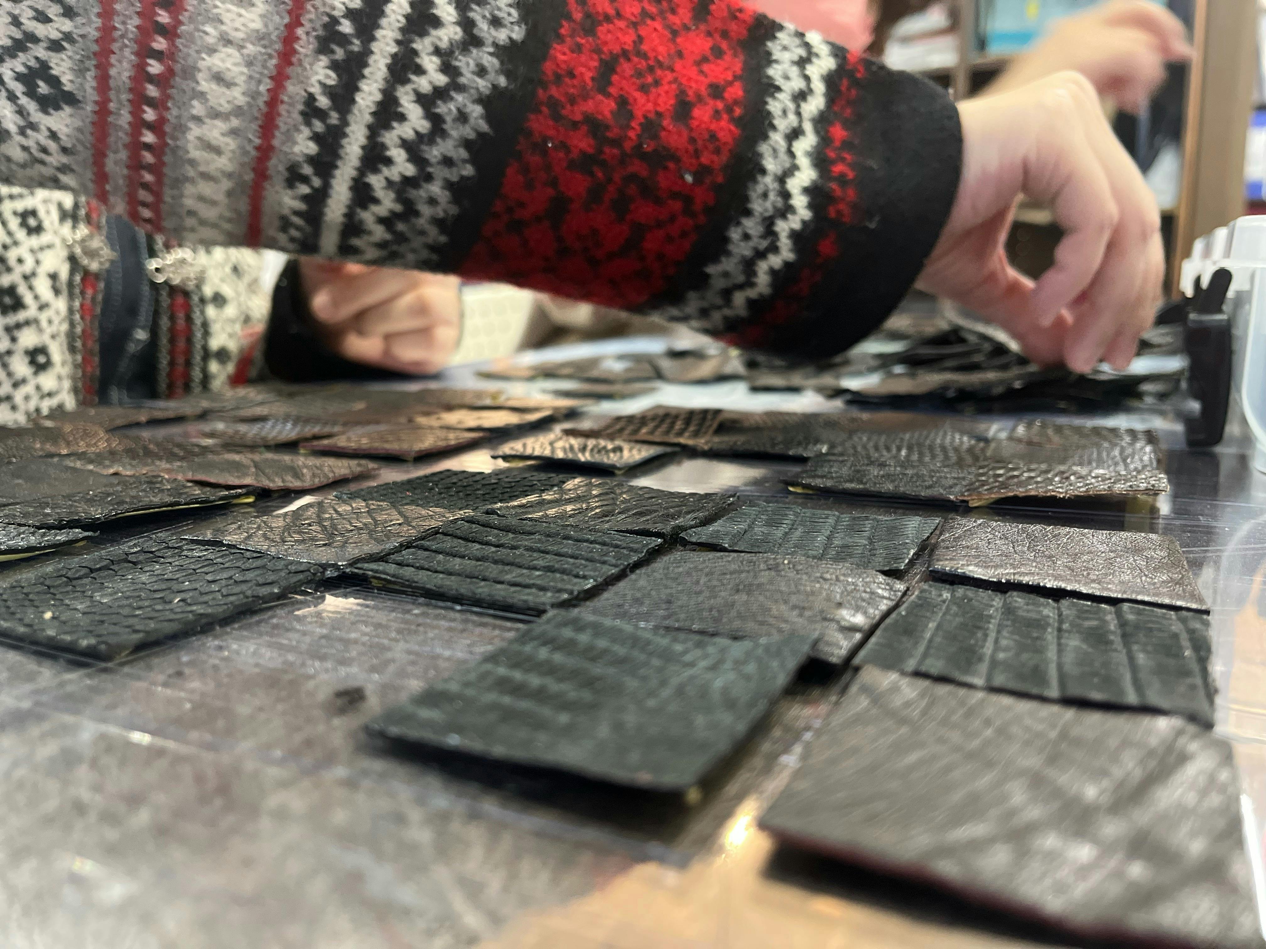 まずは、革を色別・サイズ別・に仕分けして行きます。この作業だけで、1ヵ月以上かかりました。