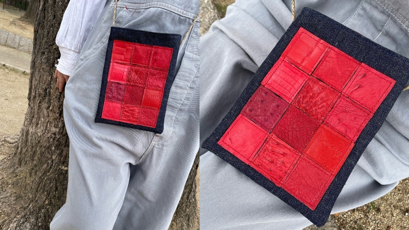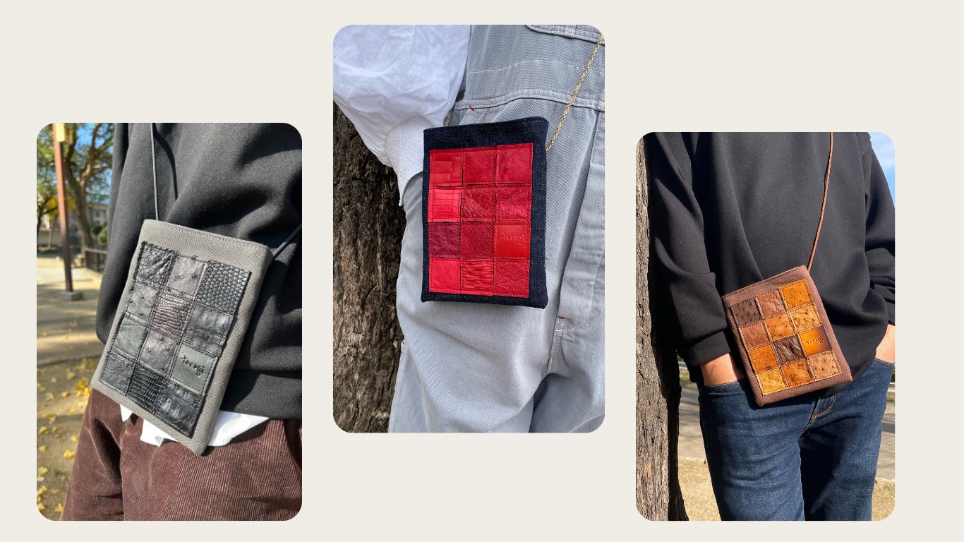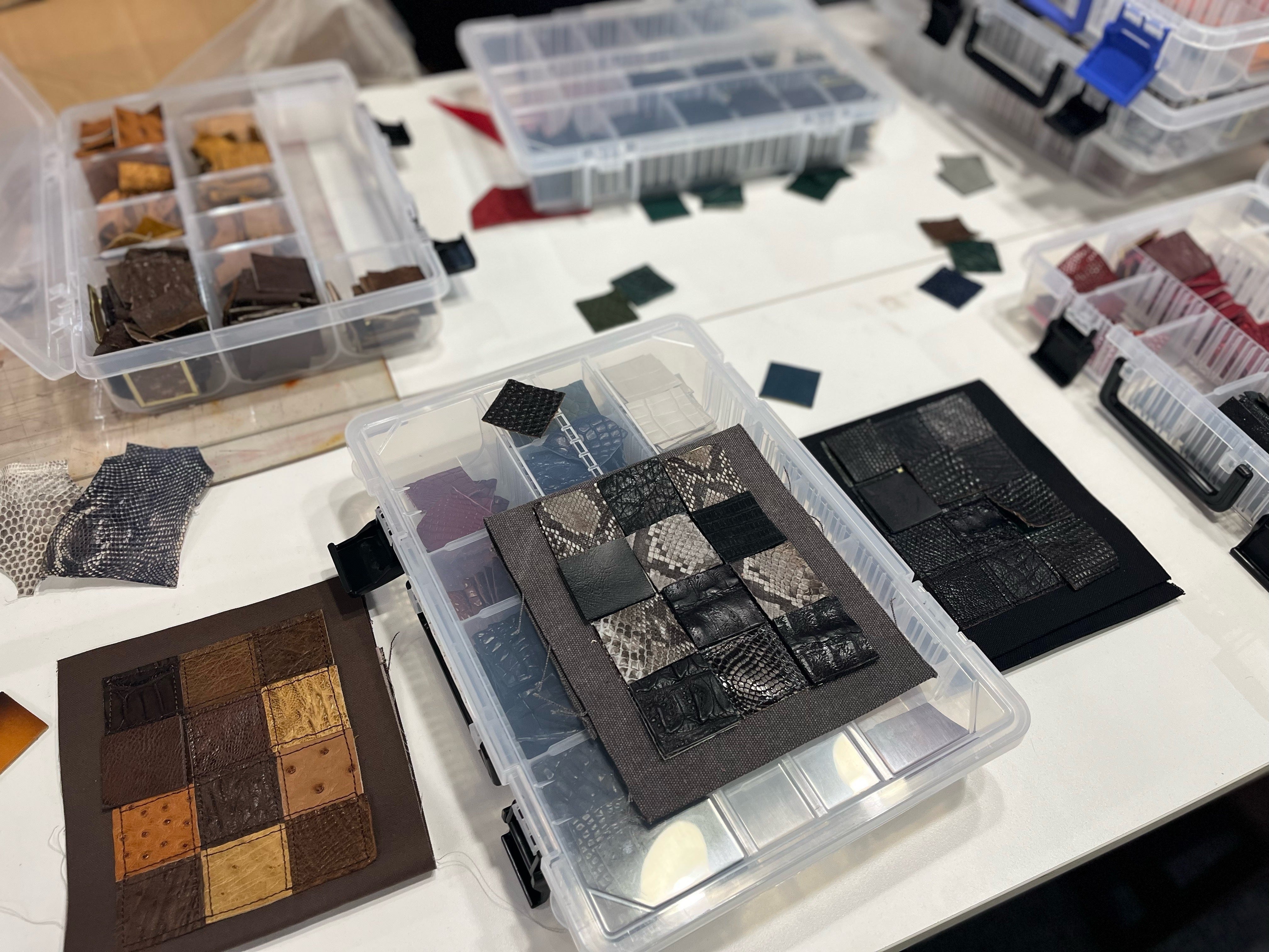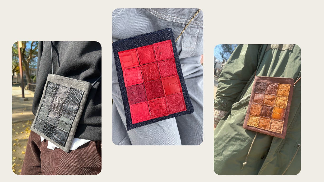 一般社団法人 日本リ・ファッション協会はリ・ファッション推進(生活スタイル提案)によって、循環型社会の実現と、生活の質的向上を目指す事を目的に活動されていおります。そのため、着なくなった洋服や使わない生地や革が協会には送られてきます。ただ、革においては取り扱いが難しいため、利用する事が出来ずに保管されておりました。高級鞄などを制作した端材ではありますがエキゾチックレザーは大変高価な物のため、いつか何かに使いたいと思っていたところ、弊社が革の端材を必要としている事を知り、弊社にその革を送って頂きました。そして今回のこのプレジェクトが実現しました! 現在は、革の供給の為にいろんな革工房にお声をかけて革を集めて頂く手配もして頂いており、代表の鈴木さまに大変感謝しております。