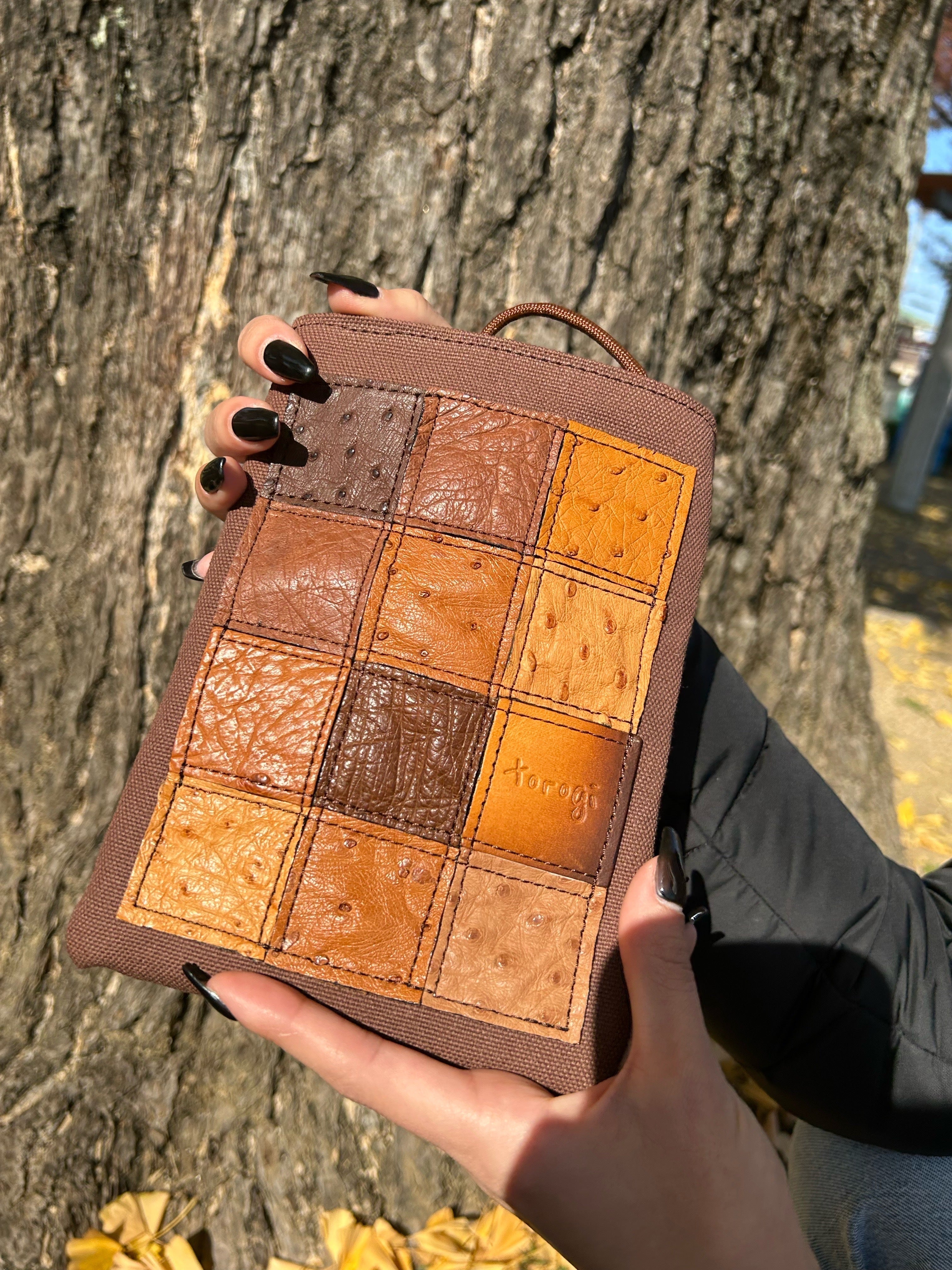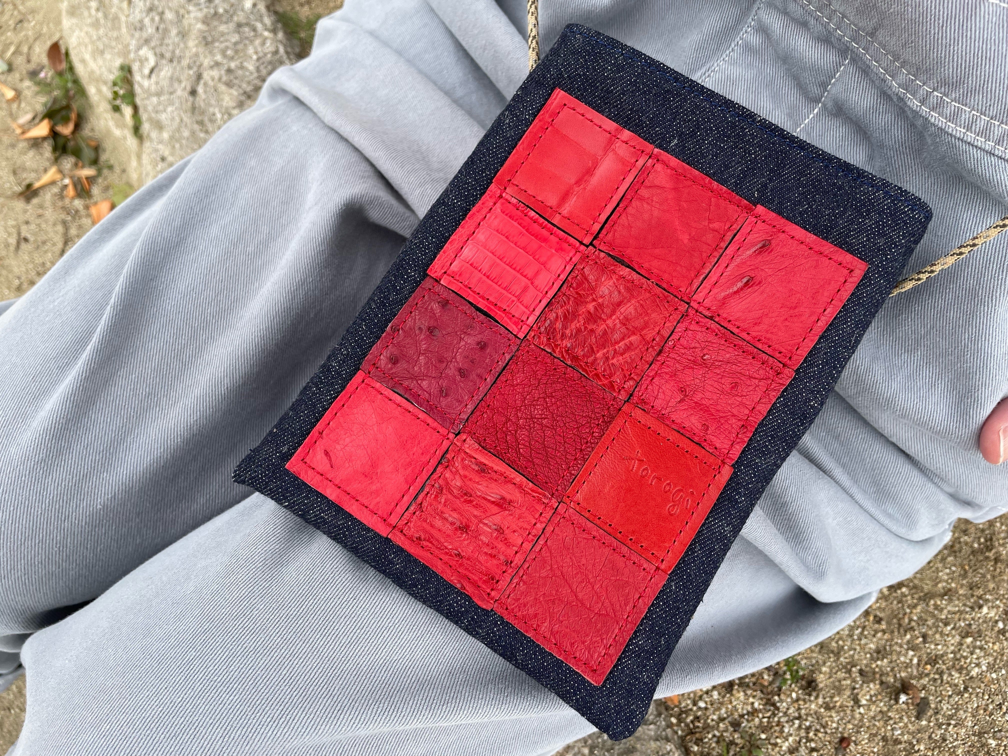 端材を使ってひとつひとつのピースを合わせたパッチワークデザインにしているため、デザインは無限!エキゾチックレザーの高級感と、本体は帆布を使用する事で耐久性も備え、使うほどに馴染む生地感でカジュアルに、かつスタイリッシュに生み出しています。