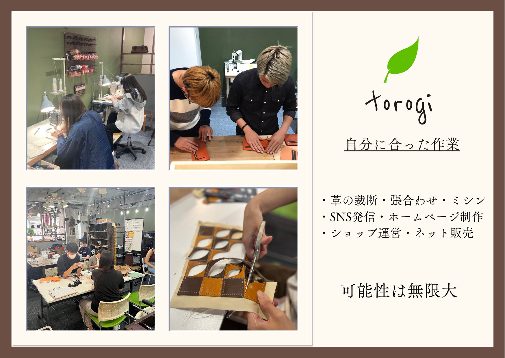障害には発達障害・精神障害・知的障がい・身体障害などさまざまです。私たちtorogiでは、訓練・支援として革製品の製造と販売を行い、大阪で1番の物作り事業所を目指しています。物作りに打ち込む事で自分の得意を見つける事ができ、遣り甲斐や悔しいや楽しいなどを感じる事が出来ます。そして社会との接点を持ち、孤立する事なく自分らしい生活を生きて欲しいと願っています。