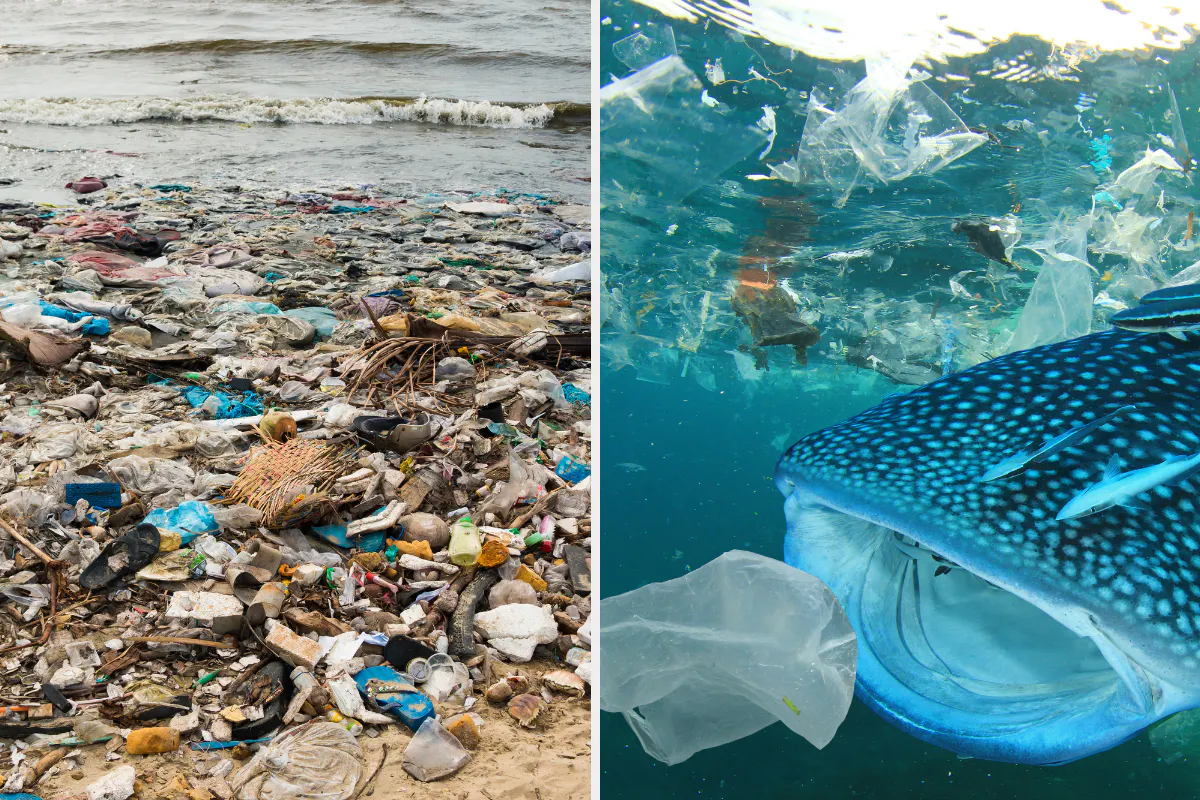 (海岸に打ち上げられたゴミやゴミ袋 それを吸い込むジンベエザメ)