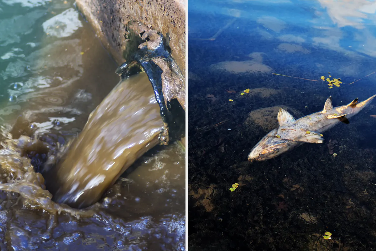 工場排水と魚の死骸