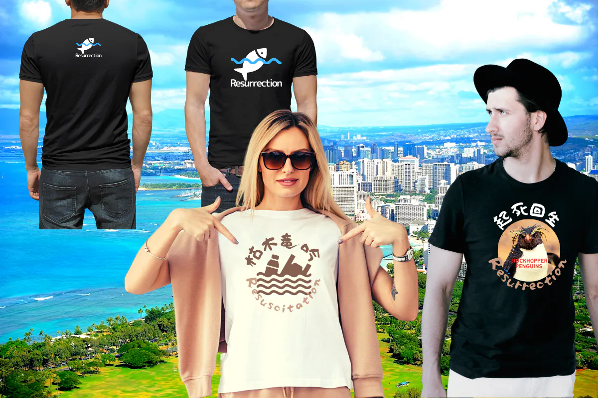 (海と魚たちの復活をイメージしたデザイン画像、素材、縫製で作る、長期間愛用できるカスタムTシャツ)
