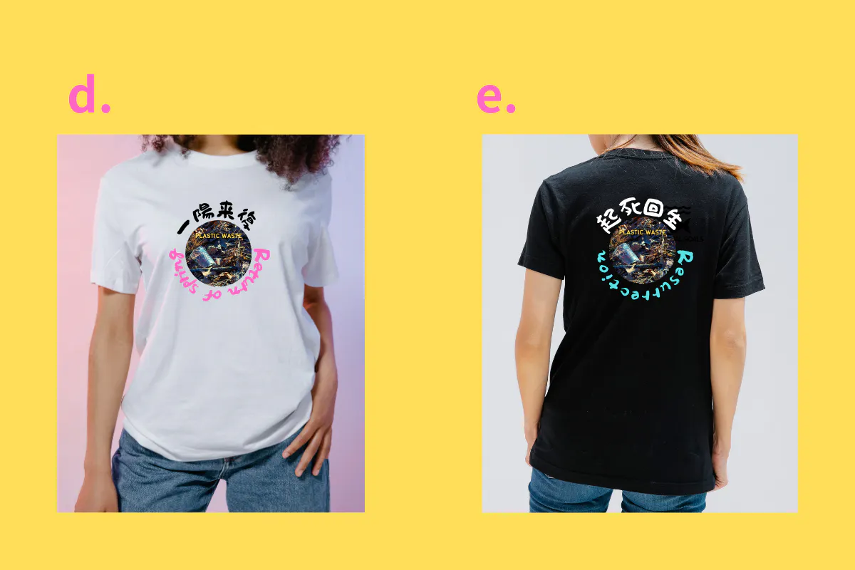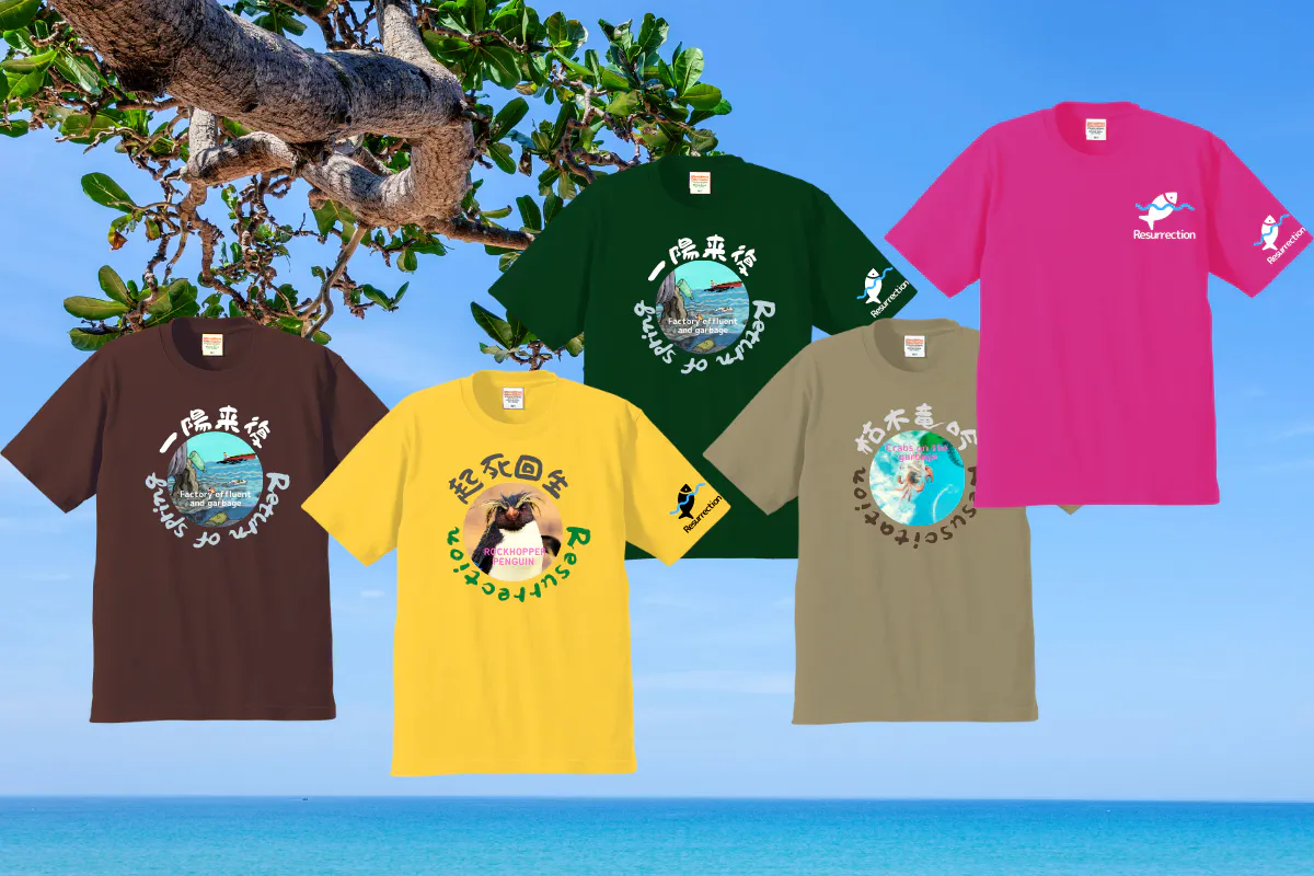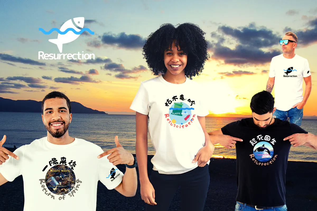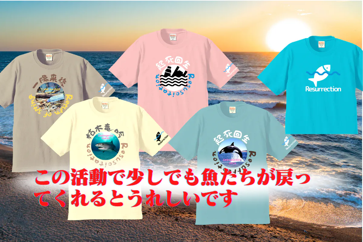 このTシャツにしたきっかけは、デザイン画像や文字を海と魚たちの復活をイメージしたTシャツにすれば、多くの人の目に触れ、意識してくれる人や清掃などボランティア協力者も増え、海と生物を守るのに役立つきっかけになると考えました。