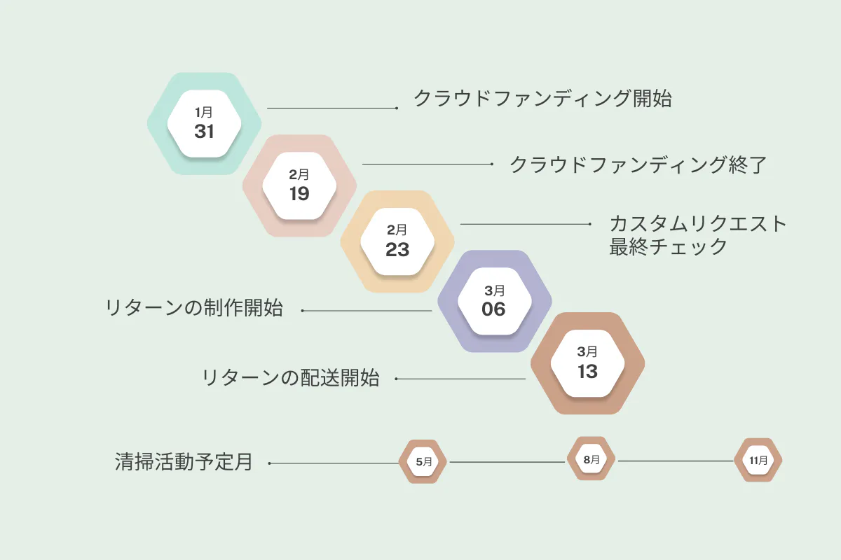 支援金は、・清掃活動費(運営、道具、備品、広告宣伝など)・リターン制作費・送料・CAMPFIRE手数料とその他通信費等の諸経費に使わせていただきます。
