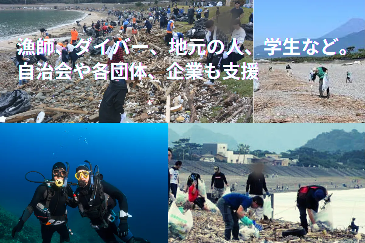 よく参加する人、漁師、漁業従事者、地域住民、SDGs提唱者など、約70~100名のボランティアが、毎回約2時間かけて海岸を清掃しています。