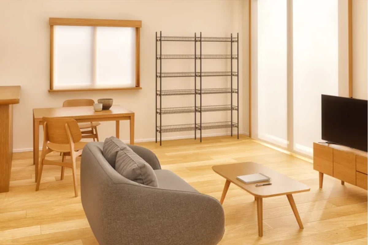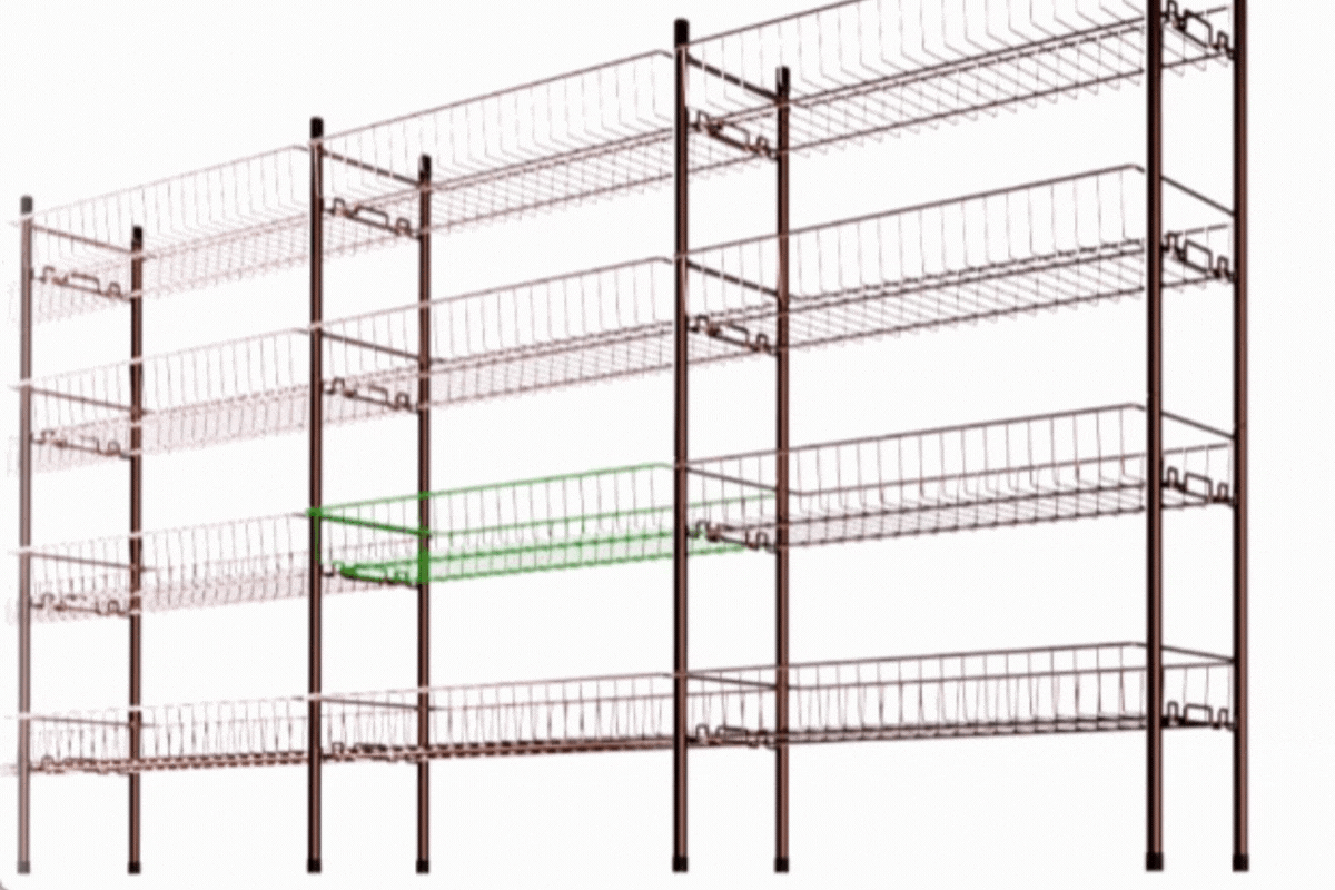 【Infinitas Space Ⅲ】のラックは中に置いたモノが落下しにくいカゴ型ラック。