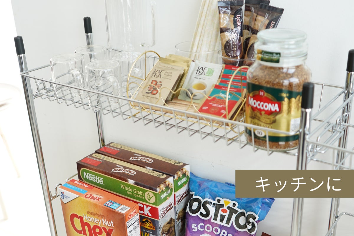 キッチンやお風呂場などで、荷物や道具の整理整頓に便利な収納ラック。