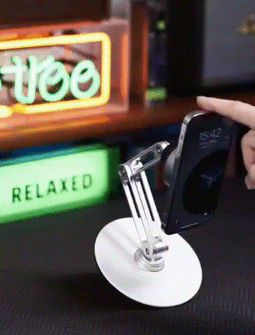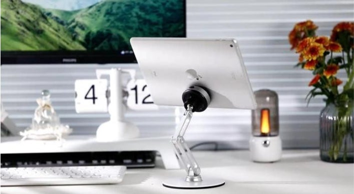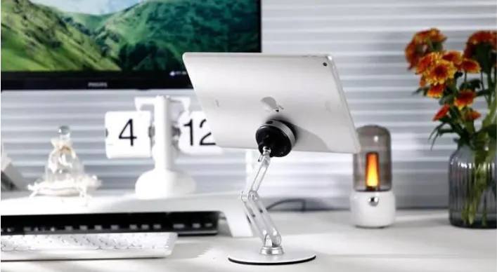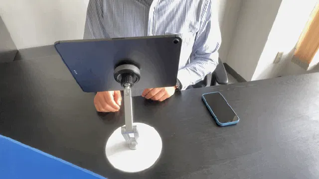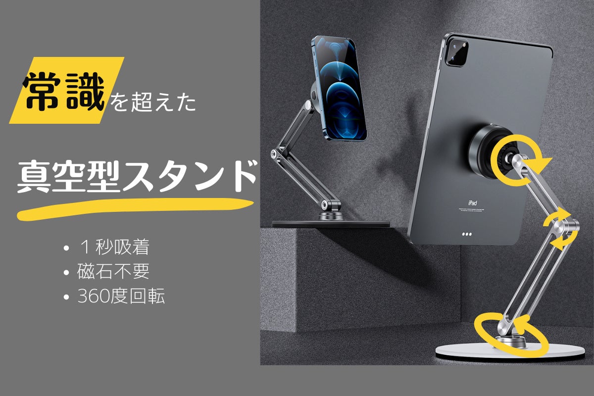 V360は真空の力でタブレットPCやスマホを保持するアームスタンド型のタブレットスタンドです。タブレットをスタンドに軽く押し付けるだけでピタッと吸着します。360度回転するので、あなたの好みの高さと角度でモニターを視聴できます。