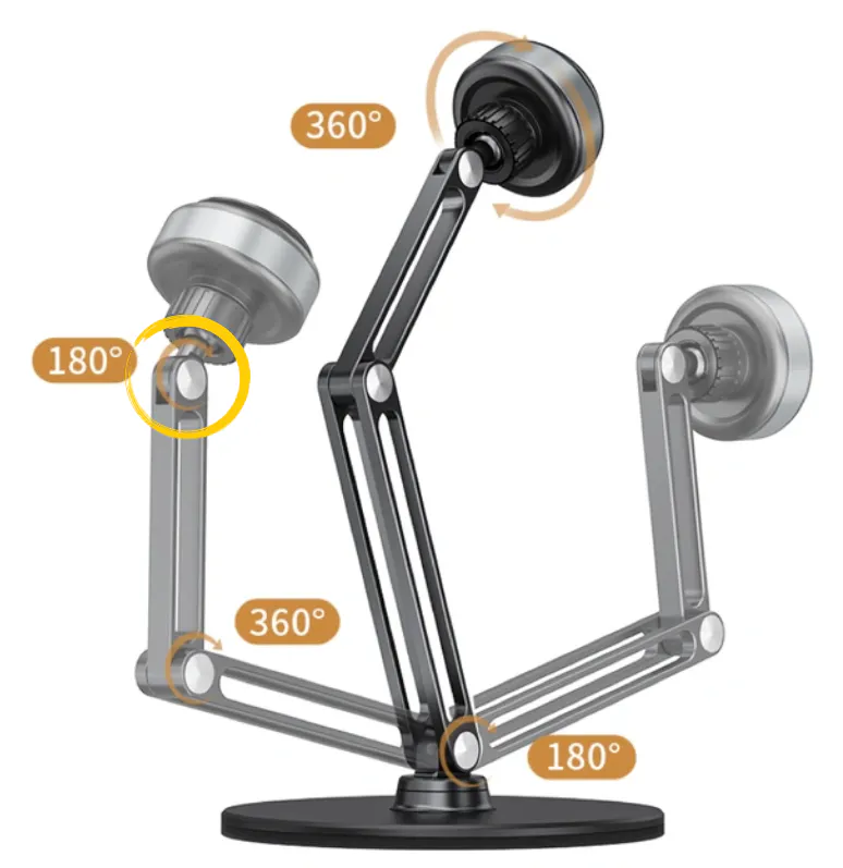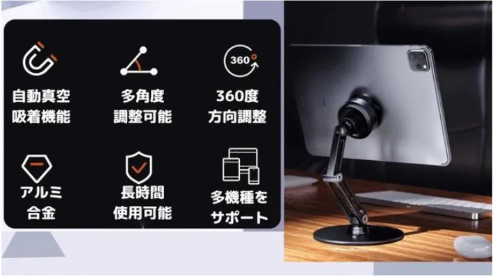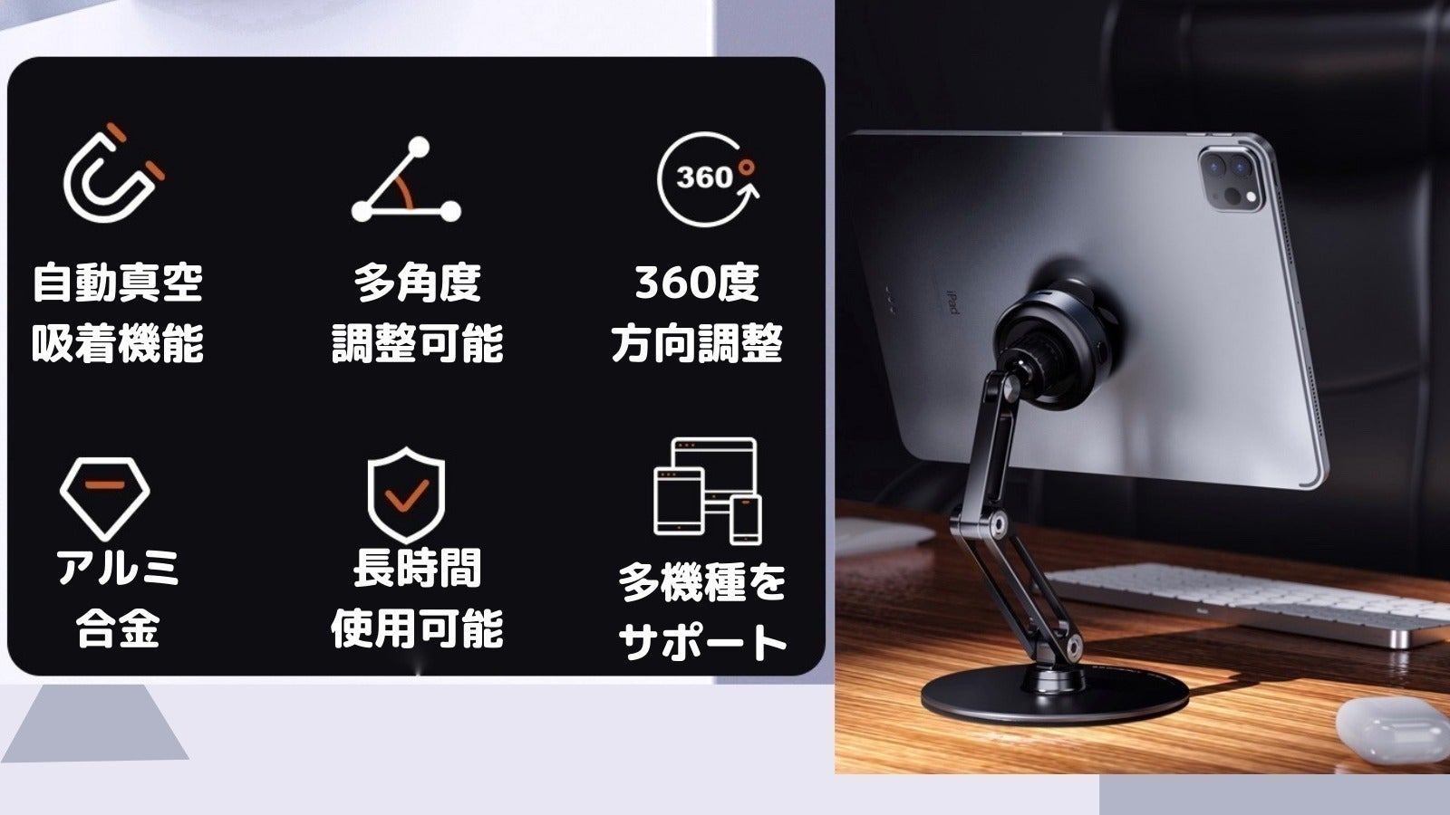 V360は真空の力でタブレットPCを脱着するアーム型スタンド。タブレットPCやスマホをスタンドに近づけるだけで自動的に吸着するので脱着が簡単。アームは高品質なアルミ合金製で、角度や高さ調節が自由自在。機種問わず、1台あれば、いろんな機材が使え、あなたのタブレットPCやスマホの利便性がワンランクアップするアイテムです。