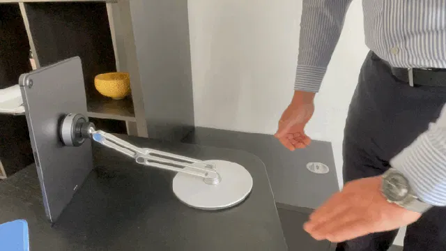またネックの部分とアーム部分は180度、ニーは360度回転するため、高さ調整も自由自在。どの高さでもモニターを垂直や任意の角度に立てられます。