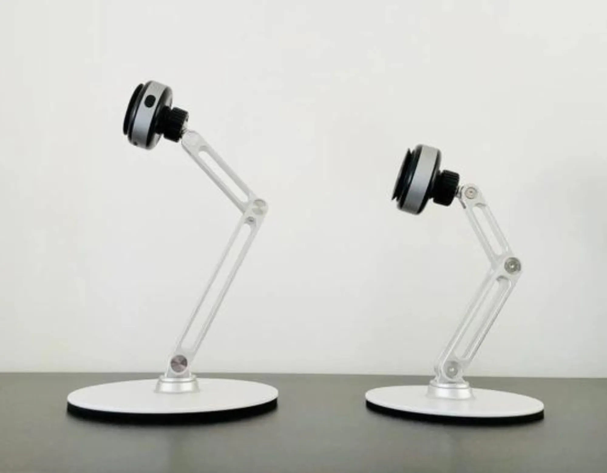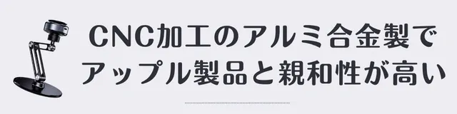 スタンドとアーム部分は軽量かつ丈夫なアルミ合金を使用しています。安価で大量生産向きのダイキャスト製ではなく、アルミ合金のインゴットからコンピューター制御で削り出すCNC(マイニング)加工で作り上げた、大変手の込んだ仕立てです。CNC加工ではパーツ1つ1つの狂いが少なく、曲線やエッジの部分もシャープに映ります。