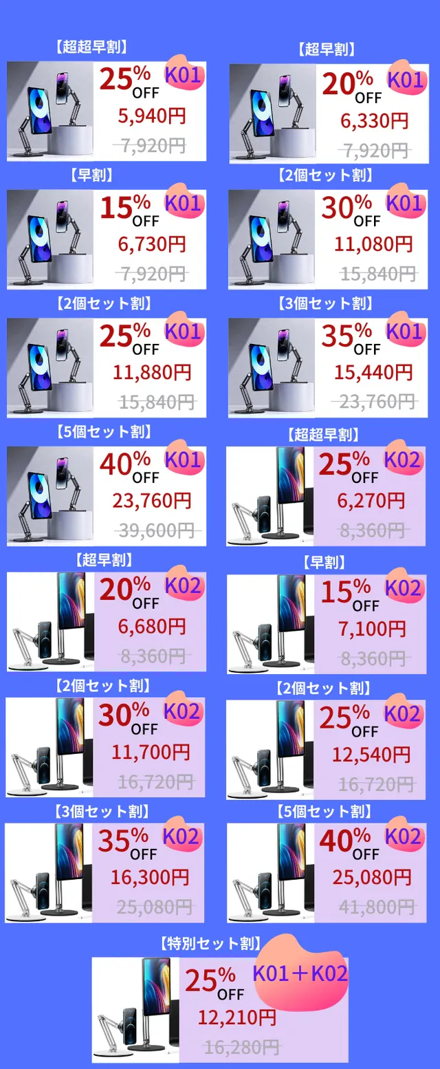 狭いデスクで使う時はV360-K01(Mサイズ)をお勧めしますが、重いタブレットの場合、V360-K02(Lサイズ)がより安定して使えます。