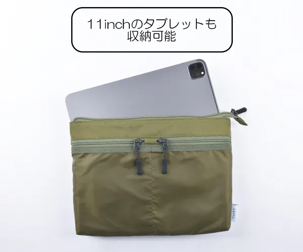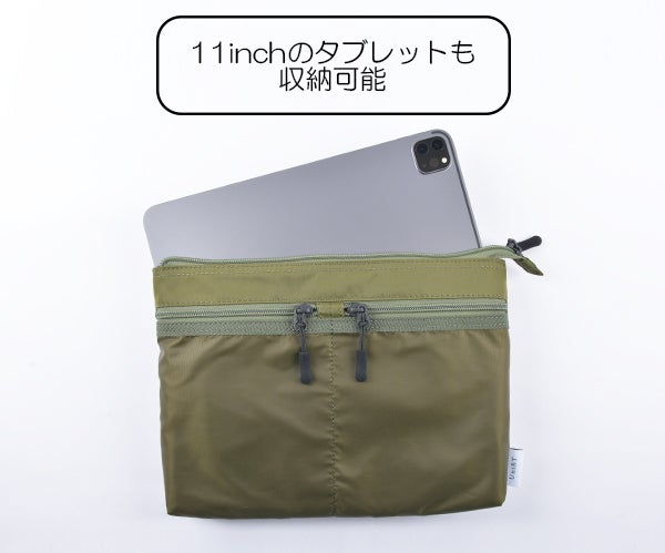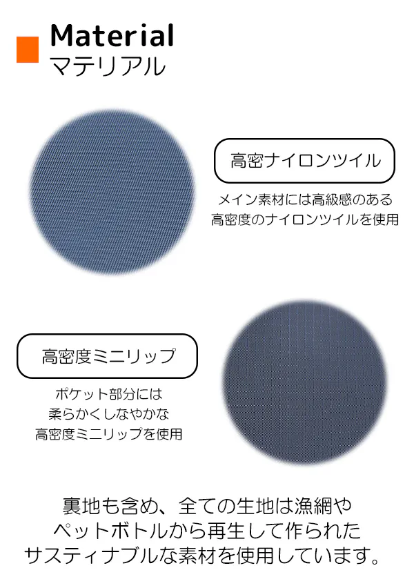 メイン素材には高級感のある高密ナイロンを使用し、フロントポケットには目の細かい上品なリップ生地を使用。