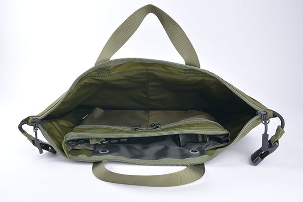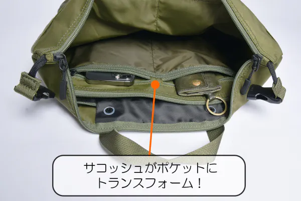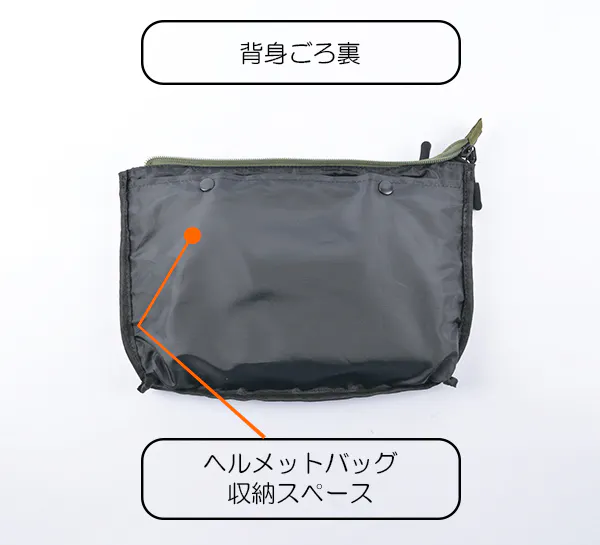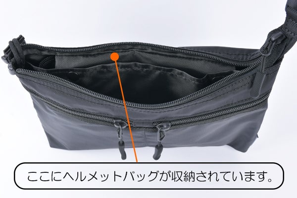 ヘルメットバッグとして使う時はサコッシュが内装ポケットになる意匠。