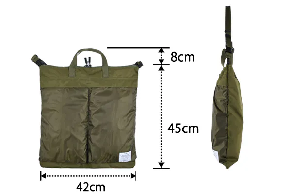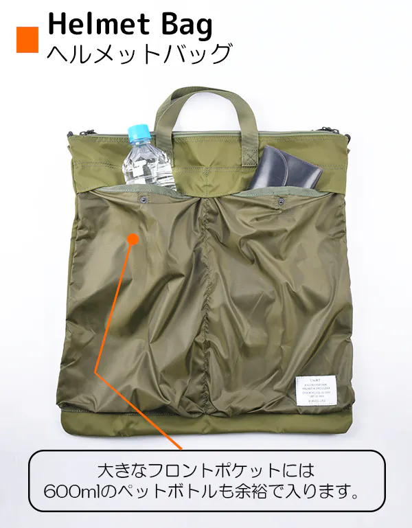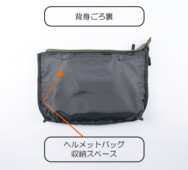 ヘルメットバッグならではの特徴的な大きなフロントポケットや脱着式のショルダーベルトや口元のダブルファスナーなど使いやすさを考えた本格的なバッグの仕様。