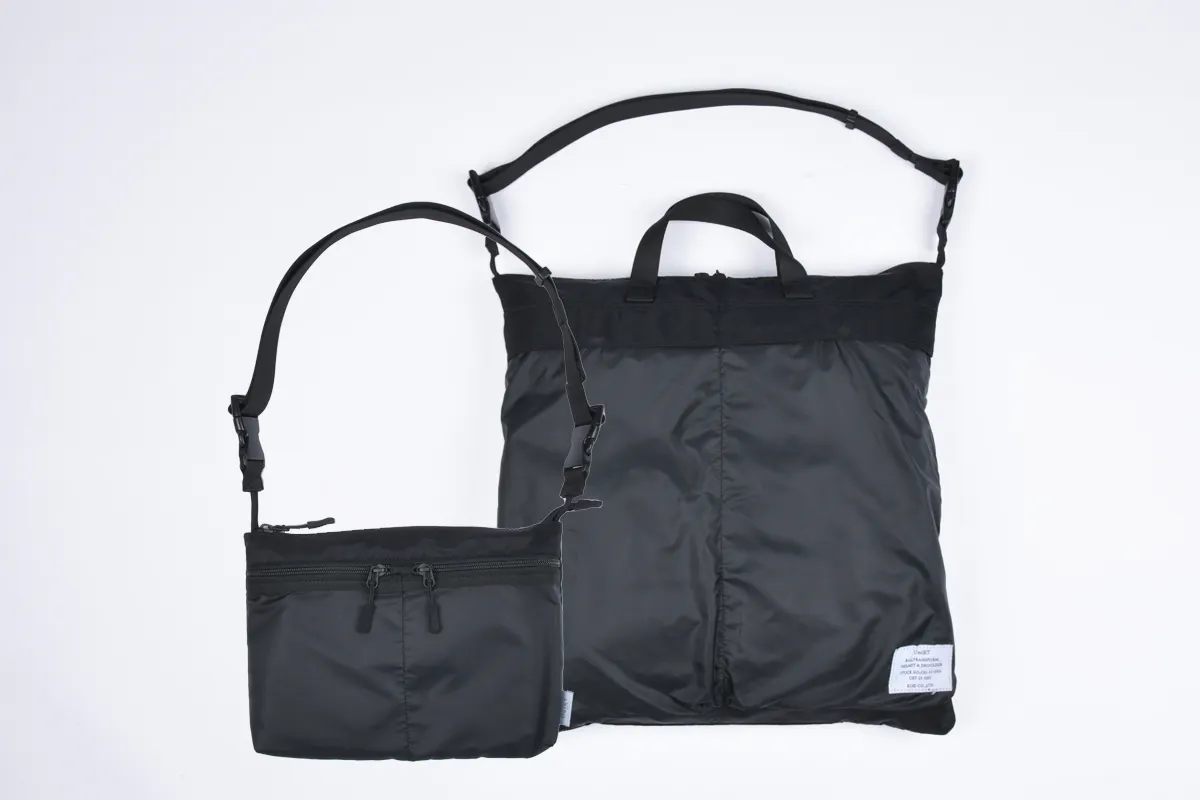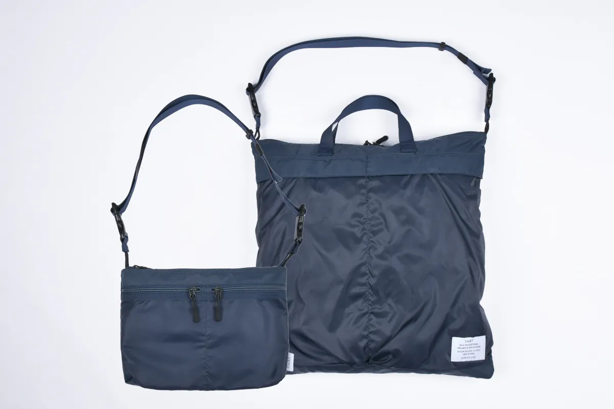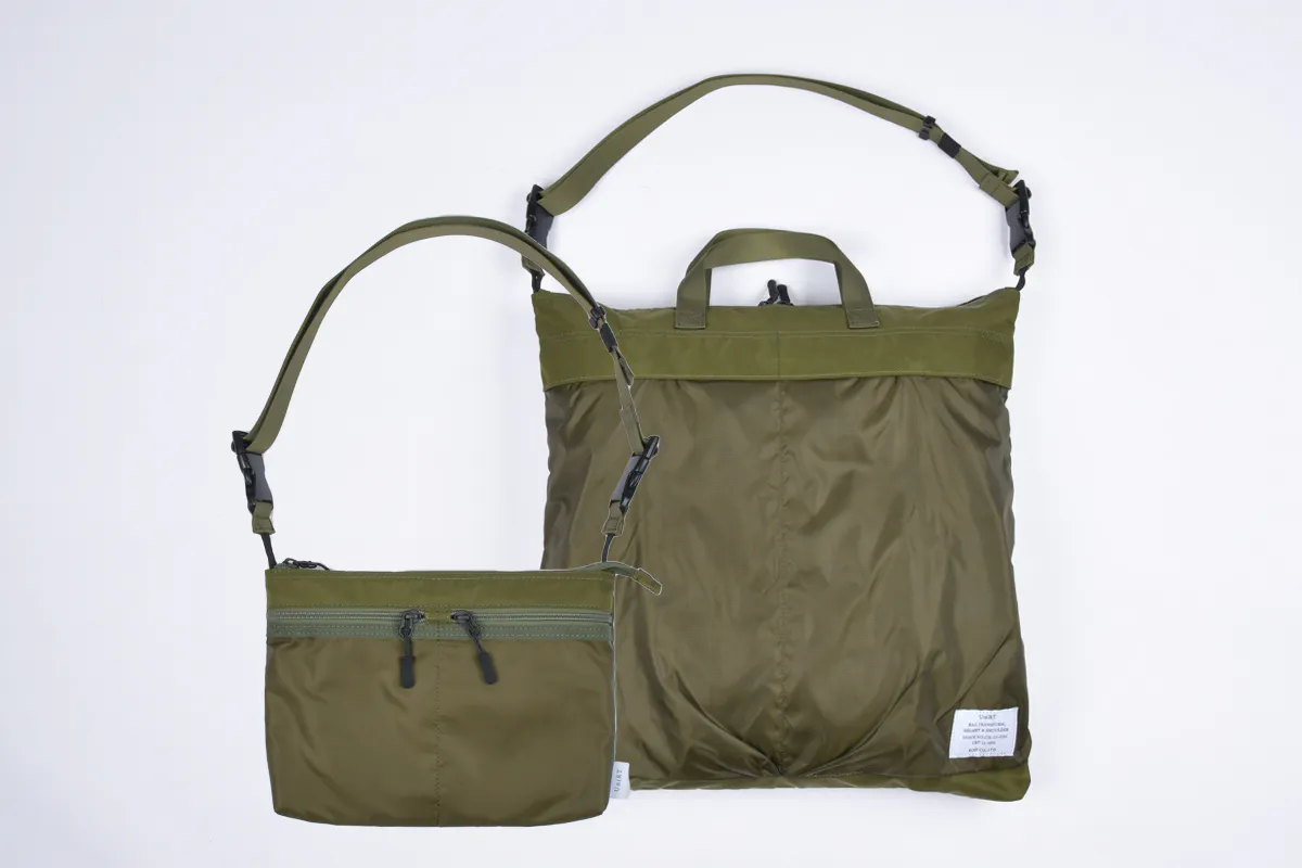 この「トランスフォームヘルメットバッグ」は身軽に使えるサコッシュに、本格仕様のヘルメットバッグが収納された外出先での急な荷物に対応出来る機能的なバッグです。