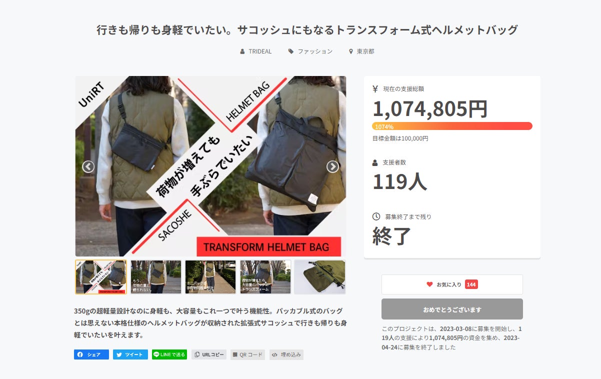 2023/04/25 10:11支援者の皆様、お世話になっております。UniRT運営チームです。トランスフォームヘルメットバッグのプロジェクトも昨日で無事終了致しました。最終的に119名の方から、1,074,805円のご支援を頂きました。沢山のご支援本当にありがとうございます。リターンのお届けに関してご連絡致します。今朝お届け先情報をダウンロードし、これから配送をする倉庫に送り先情報を共有致します。4/26~4/28までの3日間で全ての配送を完了する予定になっております。発送方法は日本郵便のクリックポストで、茨城県土浦市から出荷になります。支援者の方に個別に送り状番号の連絡は出来ませんので、1週間程度待って届かない場合はメッセージからご連絡頂けますでしょうか。こちらで荷物の状況を確認し、ご返事させて頂きます。本当に沢山の応援、ご支援ありがとうございました。これからもまだ世の中にない新しい物を開発していきますので、応援宜しくお願い致します。UniRT運営チーム もっと見る