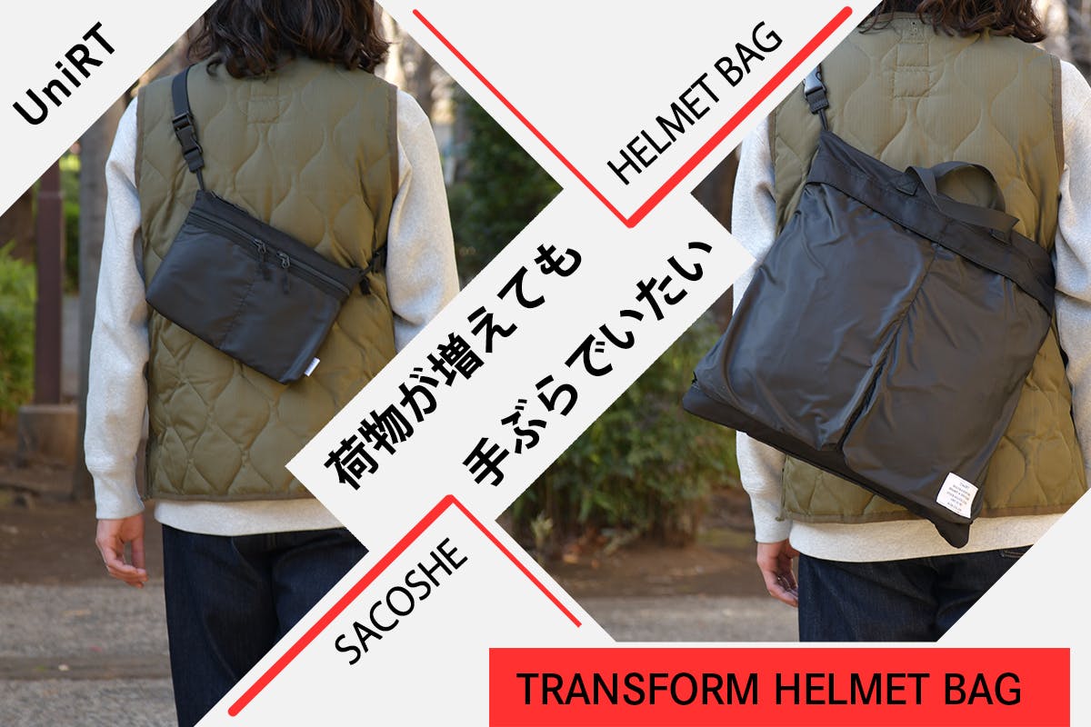 まだ世の中にないユニークな物をアイデアを持ってカタチにするブランド【UniRT】からどちらも主役で使えるトランスフォーム式パッカブルバッグ「トランスフォームヘルメットバッグ」のご紹介です。