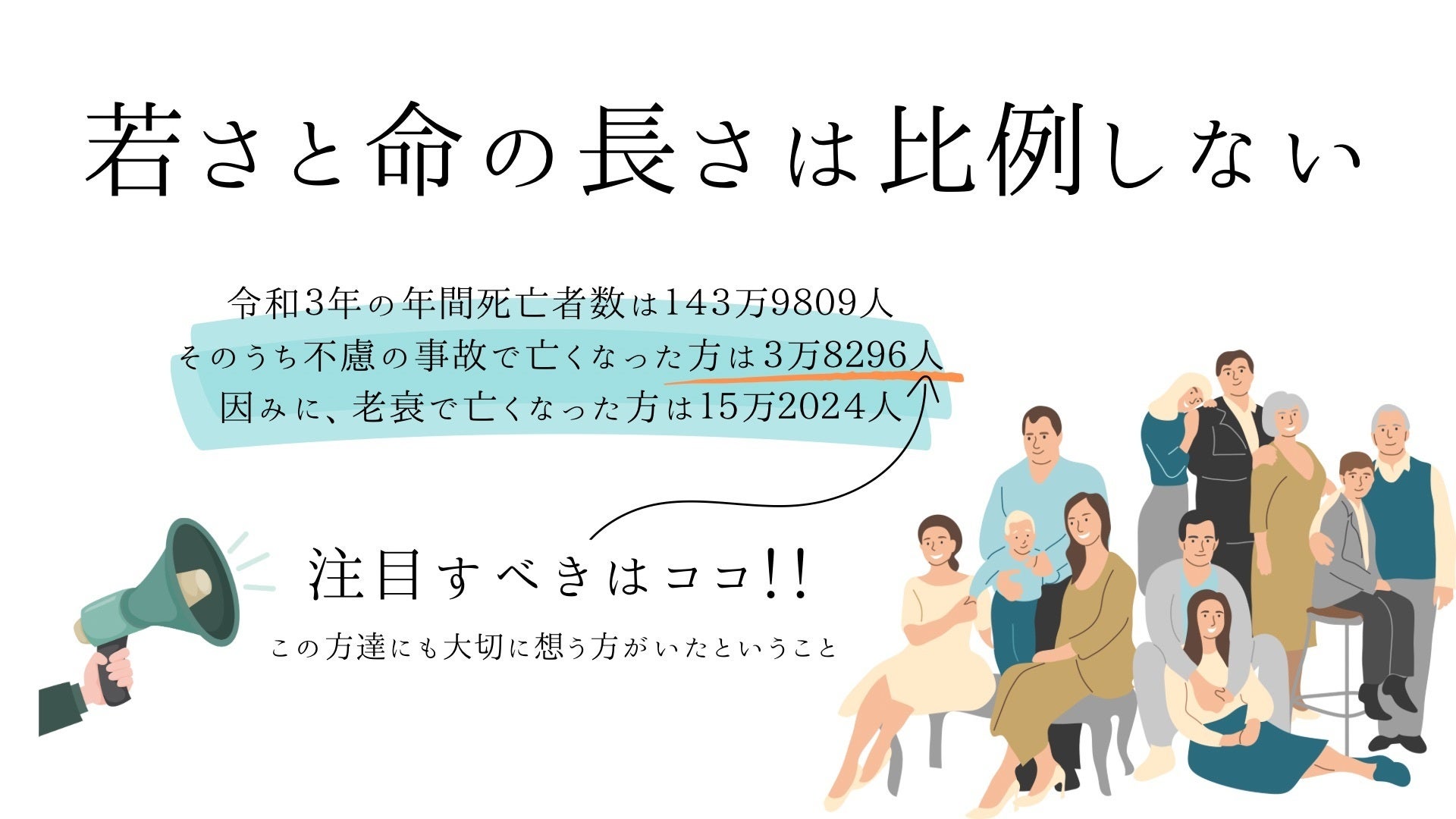 日本では年間140万人の方が亡くなっています。そのうち遺言書が残されているのはたった1割程度です。それは”遺言や終活=高齢になってから”というイメージがあり、どこか遠い存在に感じている方があまりに多いからなのではないかと考えました。ですが、先ほどの年間死者数の死亡原因は必ずしも老衰や病気ではなく、不慮の事故で突然無くなってしまう命があるこという点にも着目していただきたいのです。