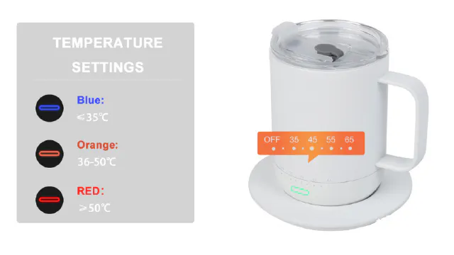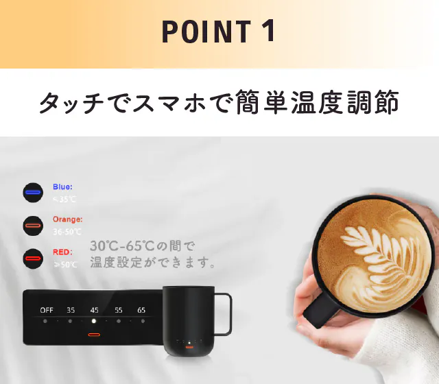 マグ本体のタッチボタン、またはVSITOOアプリで簡単に温度調整することができます。30℃-65℃の範囲でお好きな温度に設定してください