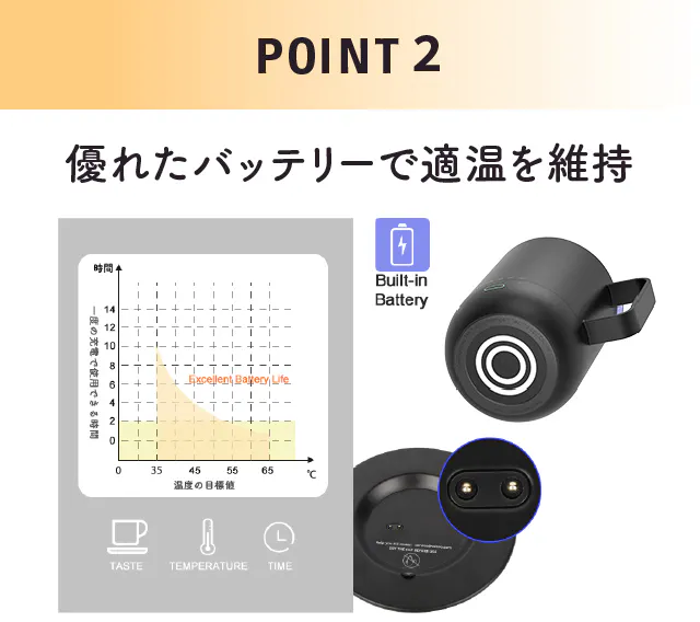 マグ本体には大容量リチウム電池を内蔵しているので単体で※約4~8時間、充電コースターを利用すれば一日中適温を維持することができます。