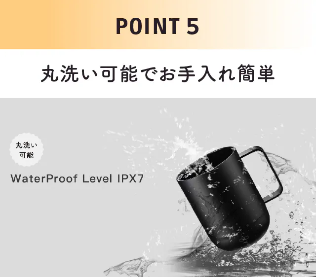 IPX7等級の耐水性能があるため、安心して手洗いすることが可能です。長時間の浸水はしないようにご注意ください。また、食洗機、レンジの使用はできません。