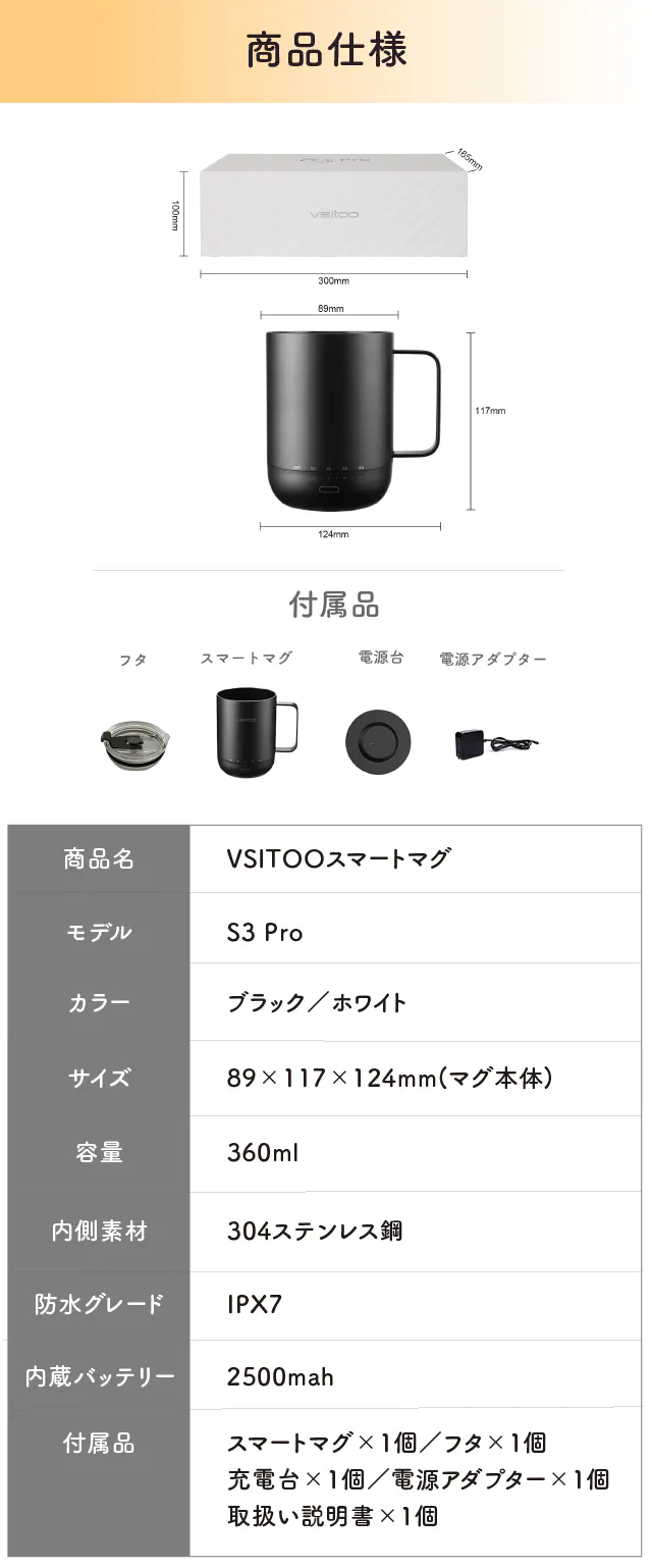→冷たいお飲み物で利用する場合は電源をOFFにして使用して下さい。温度を設定して保持することはできませんが、VSITOOのマグ本体はステンレスの二重構造なので結露することもなく、一般的なマグカップよりも長時間ドリンクを冷たくキープすることができます。
