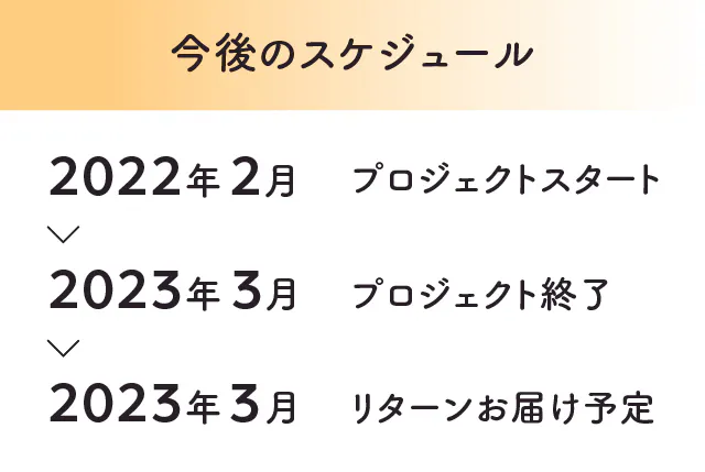 ※本文中に記載させていただいたスケジュールは、あくまでプロジェクト公開時点の予定です。ご支援の性質上、配送遅延のおそれがございます。原則として、配送遅延に伴うご支援のキャンセルはできませんが、リターン配送予定月から6ヵ月を超えた場合には、希望者に限りキャンセルにて対応させていただきます。 以上の注意点につきましてあらかじめご理解とご了承いただいた上でご支援くださいますよう、よろしくお願い申し上げます。