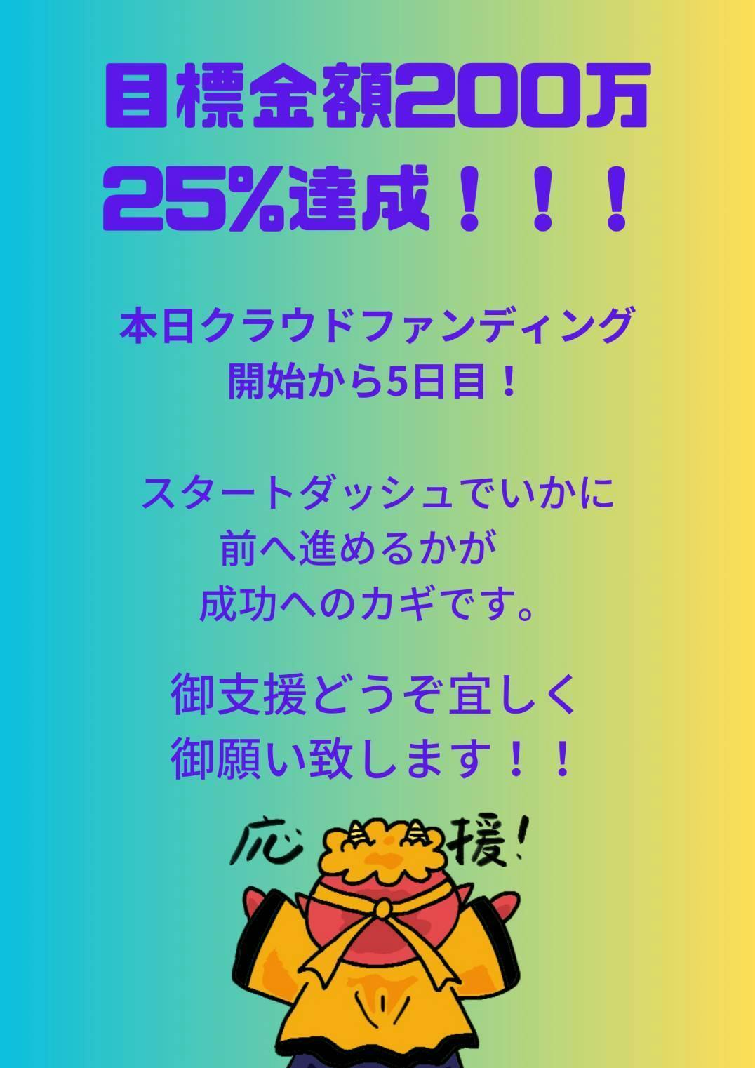 本日がクラウドファンディング開始5日目です!現状目標金額の25%を達成することができています!