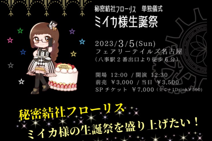 2023/3/5(日)に、メンバーの1人であるミイカ様の生誕祭がライブハウスフェアリーテイルズで開催されます。