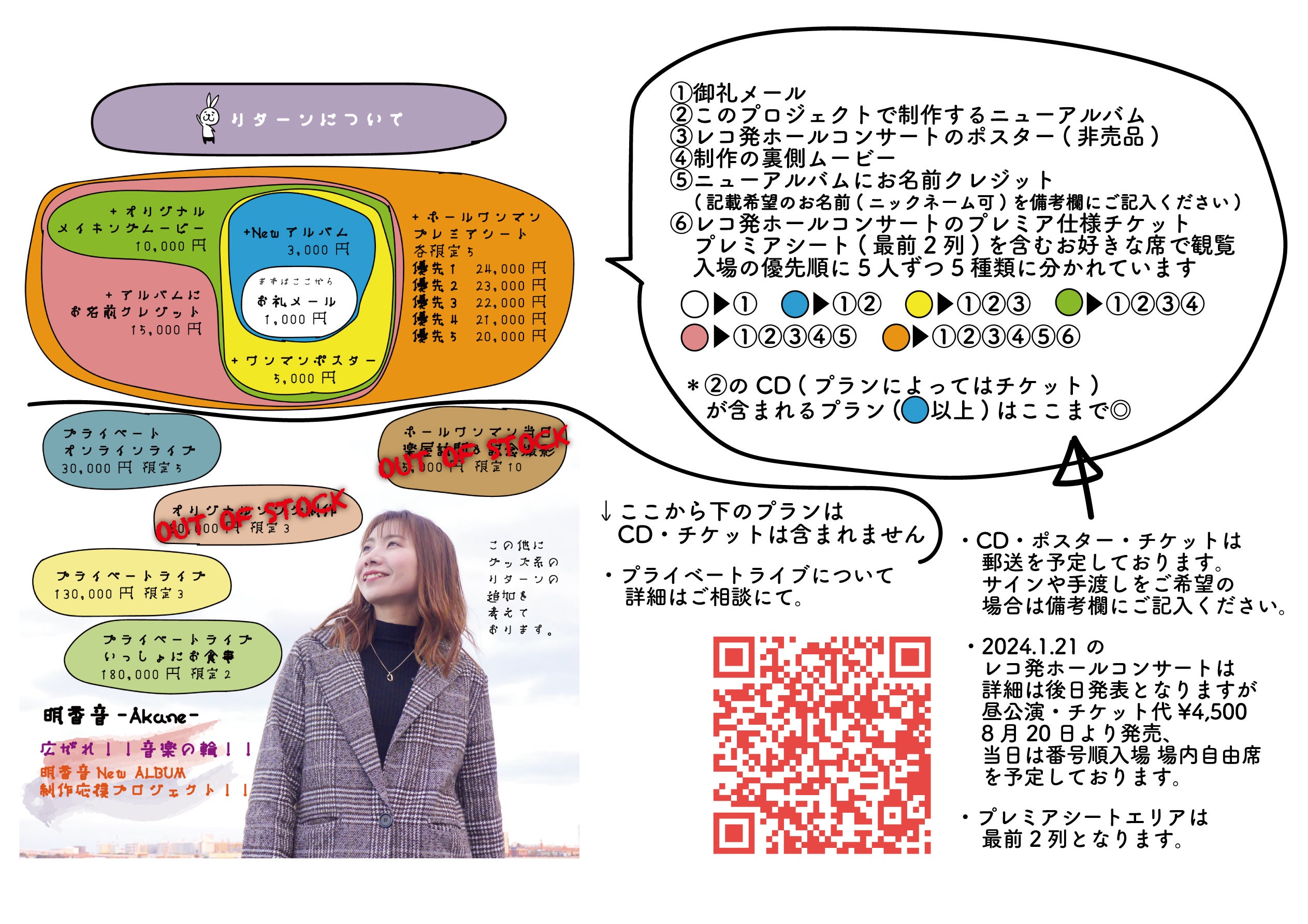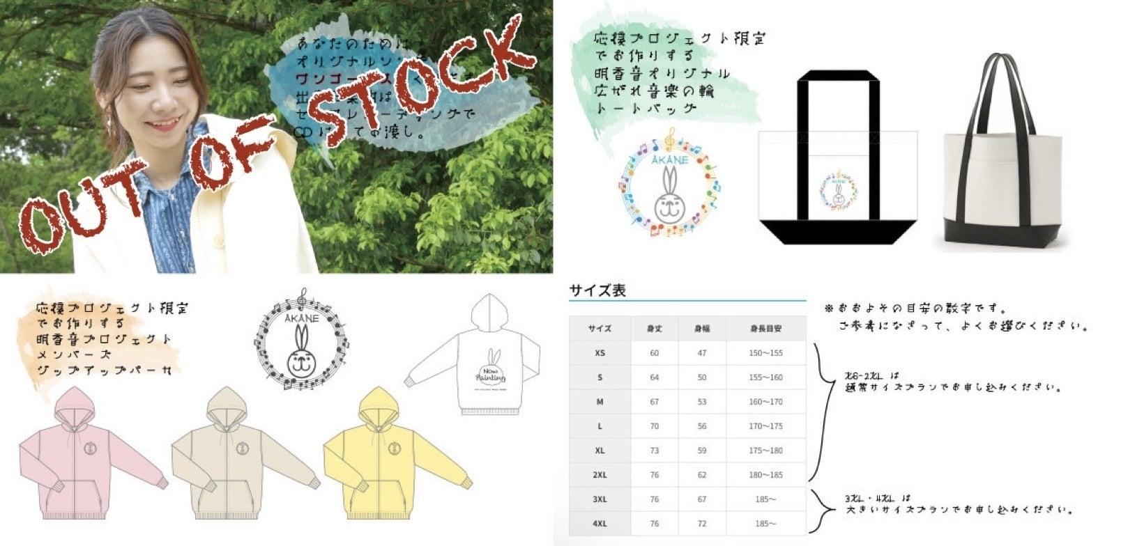 2023/04/27 21:30「限定パーカのバックプリントデザインができました◎」このプロジェクト限定でお作りするジップアップパーカのバックプリントができましたのでお知らせいたします。このために明香音が描き下ろしました明香音公式キャラクターおっさんうさぎのまゆげが花束を持ったデザインです。こちらは、アルバムの発売日でもある2024年1月21日のホールワンマンの公演タイトルにちなんでおります。まだお申し込みでない方も、ぜひ一緒にこのパーカを着てみませんか♪ もっと見る